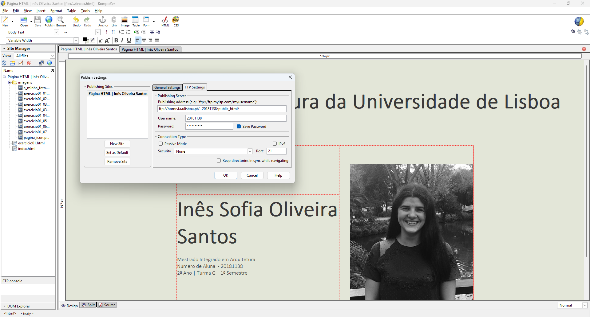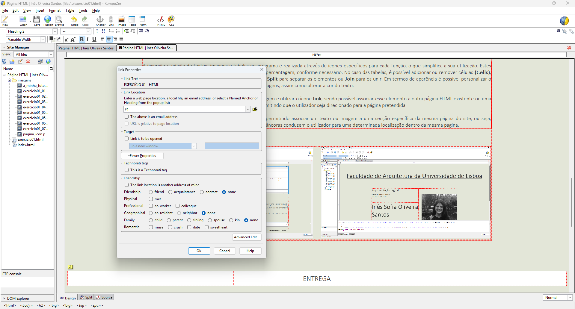Para criar ligações, basta selecionar um texto ou uma imagem e utilizar o ícone link, sendo possível associar esse elemento a outra página HTML existente ou uma página online, como por exemplo, o site da faculdade, permitindo que o utilizador seja direcionado para a página pretendida.