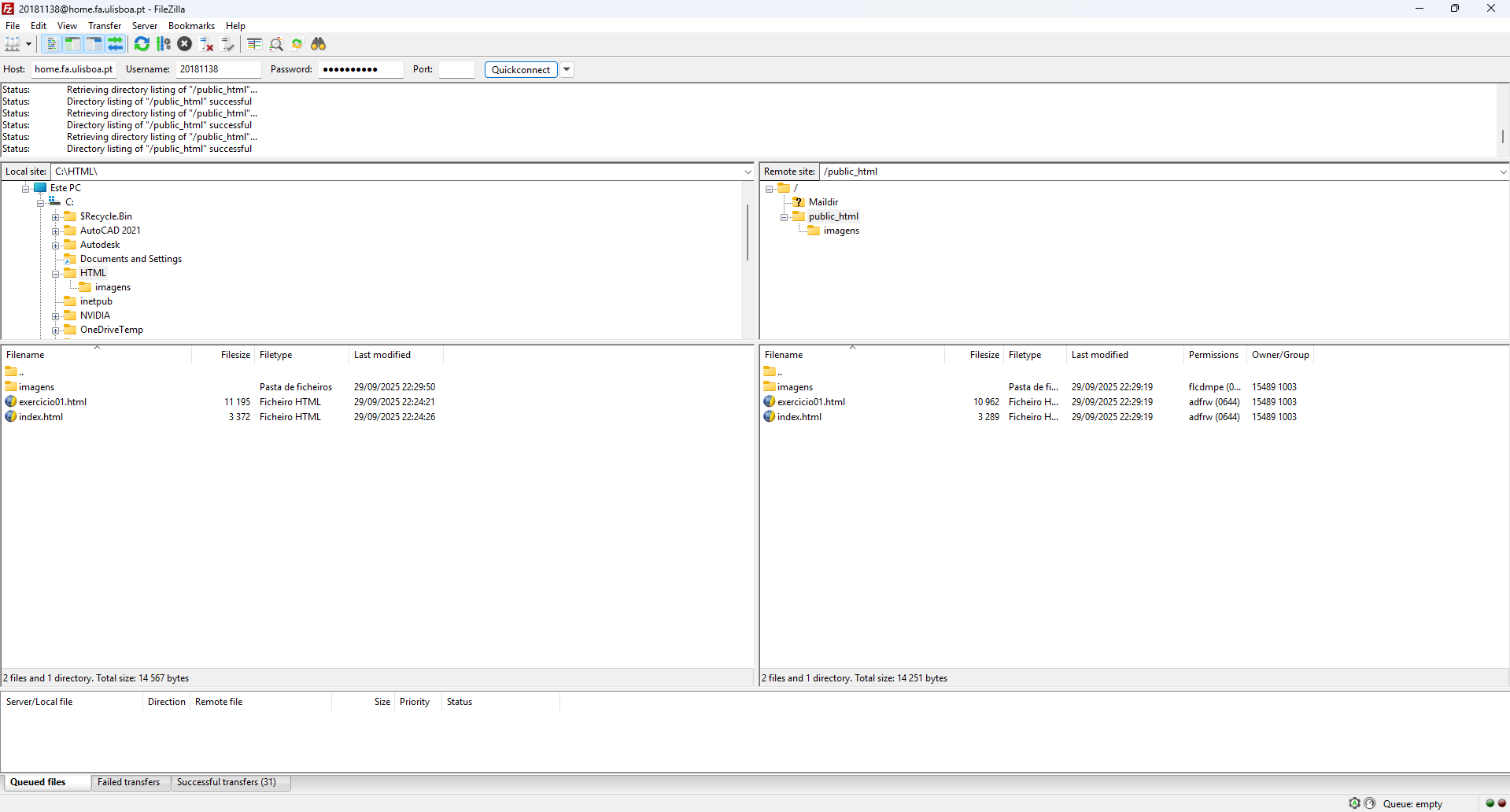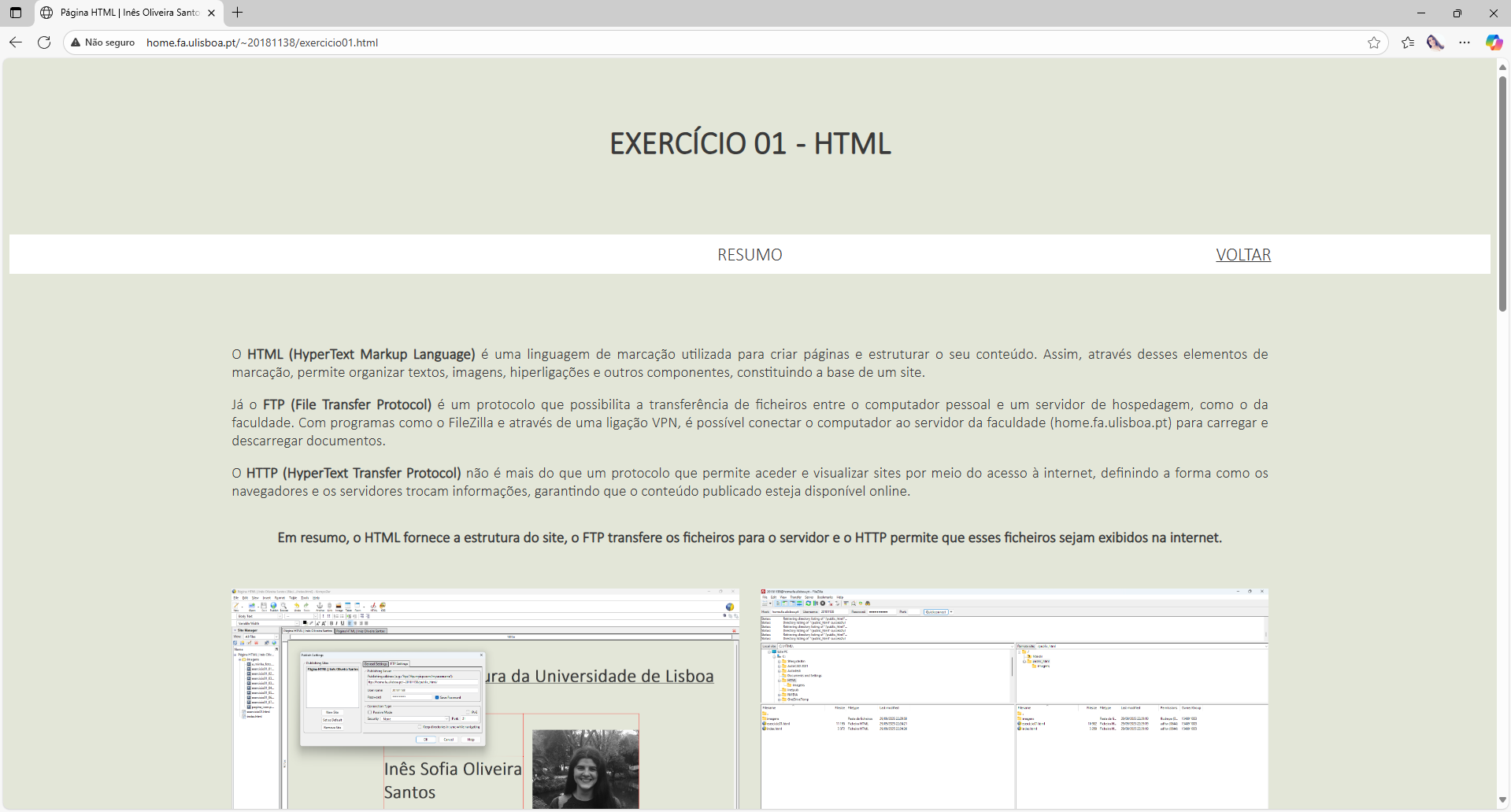 Já o FTP (File Transfer Protocol) é um protocolo que possibilita a transferência de ficheiros entre o computador pessoal e um servidor de hospedagem, como o da faculdade. Com programas como o FileZilla e através de uma ligação VPN, é possível conectar o computador ao servidor da faculdade (home.fa.ulisboa.pt) para carregar e descarregar documentos. O HTTP (HyperText Transfer Protocol)