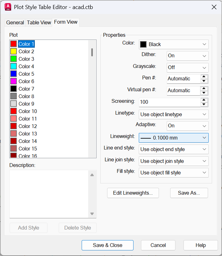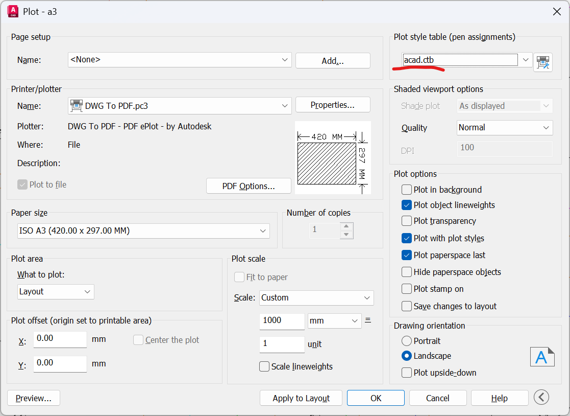 Configuração de plot para impressão em escala correta e definição de espessuras de linha.
