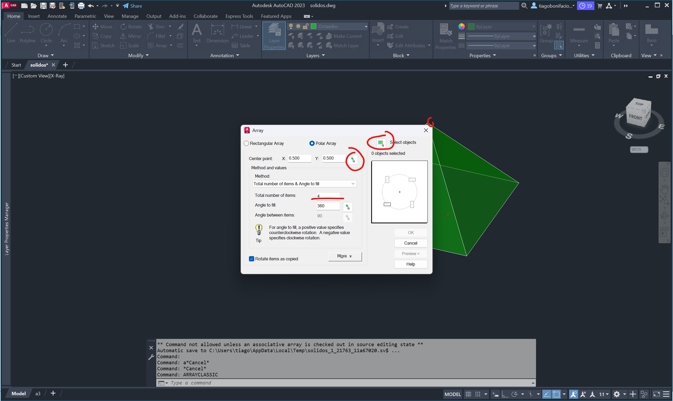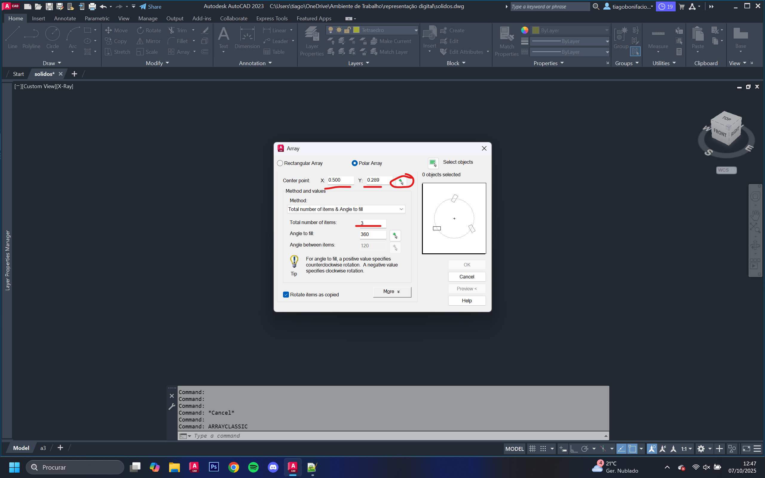 O processo envolveu a manipulação do sistema de coordenadas através do UCS para alterar os eixos de trabalho, e o comando ROTATE para rodar os objetos conforme necessário. Utilizámos 3DPOLY para criar polilinhas tridimensionais que definiram as arestas dos sólidos.