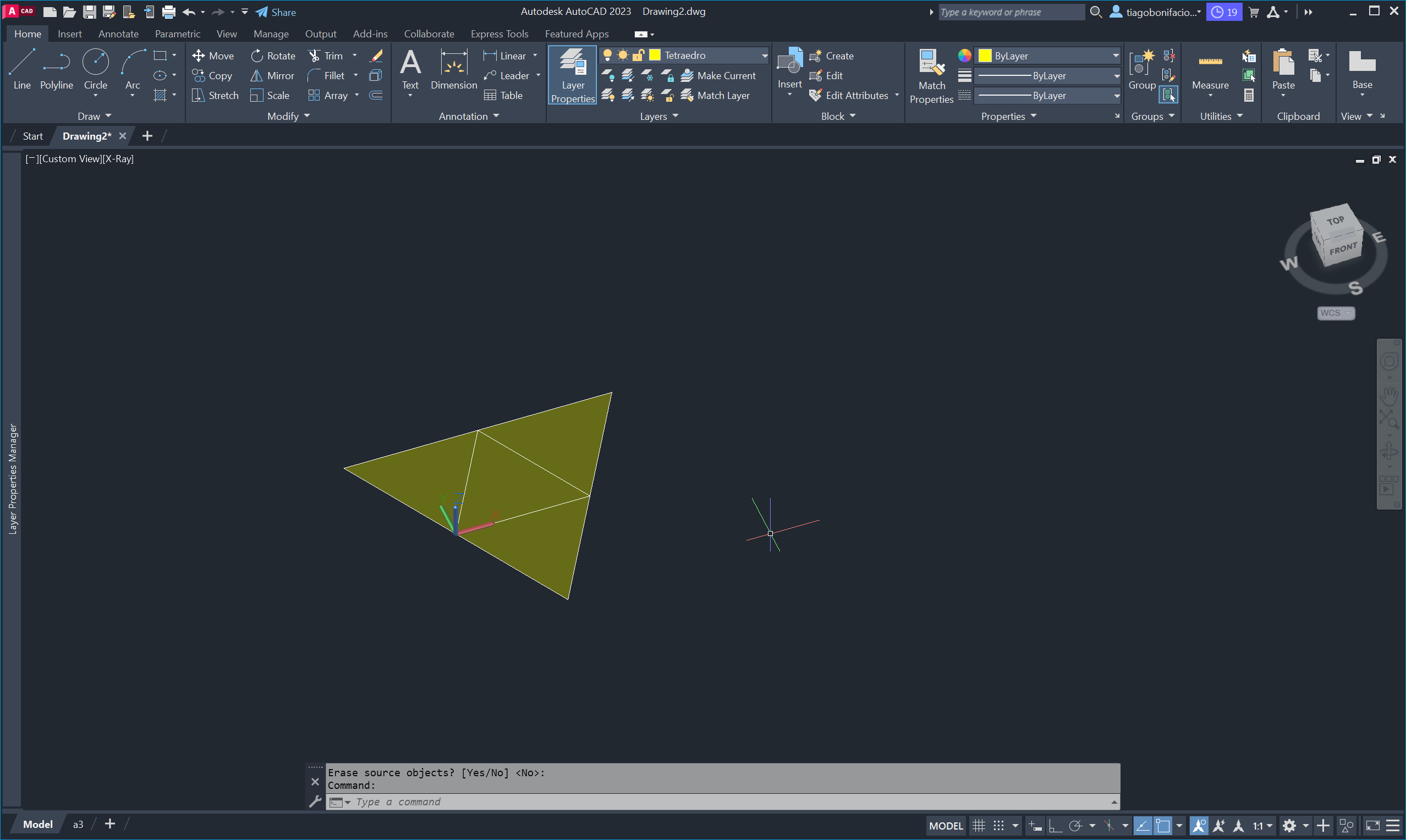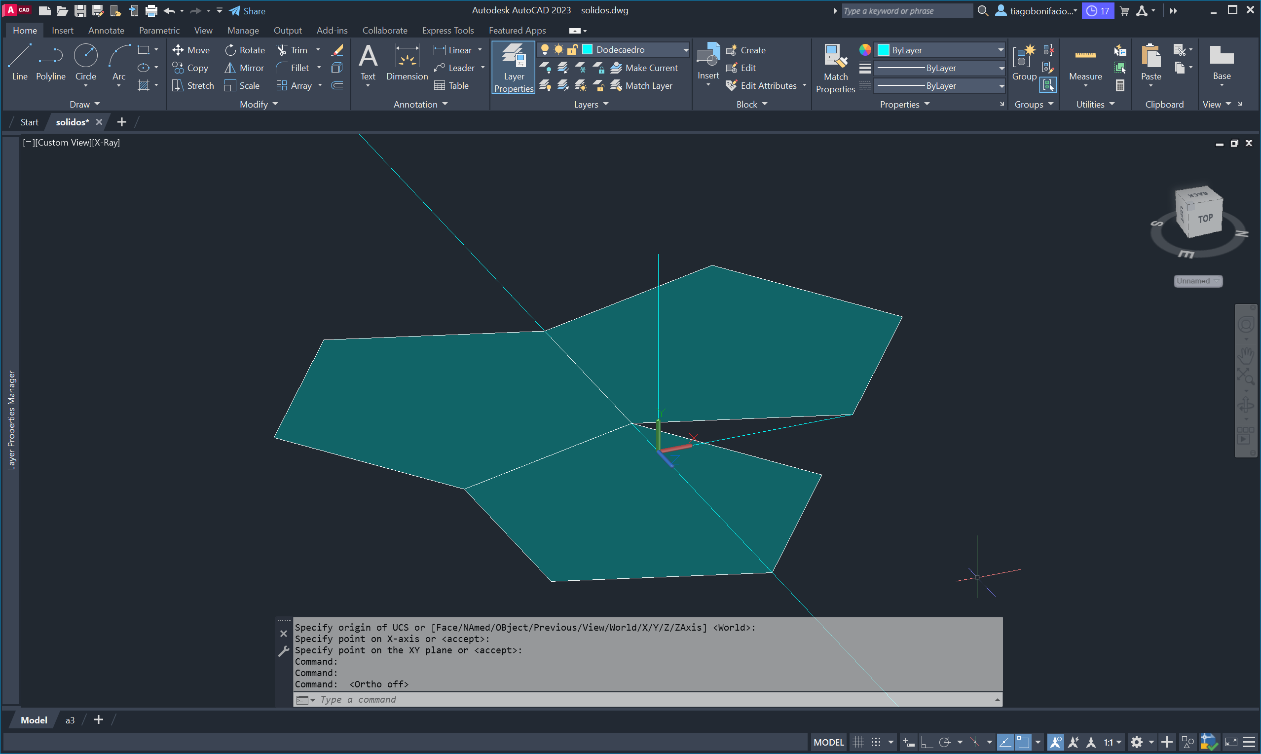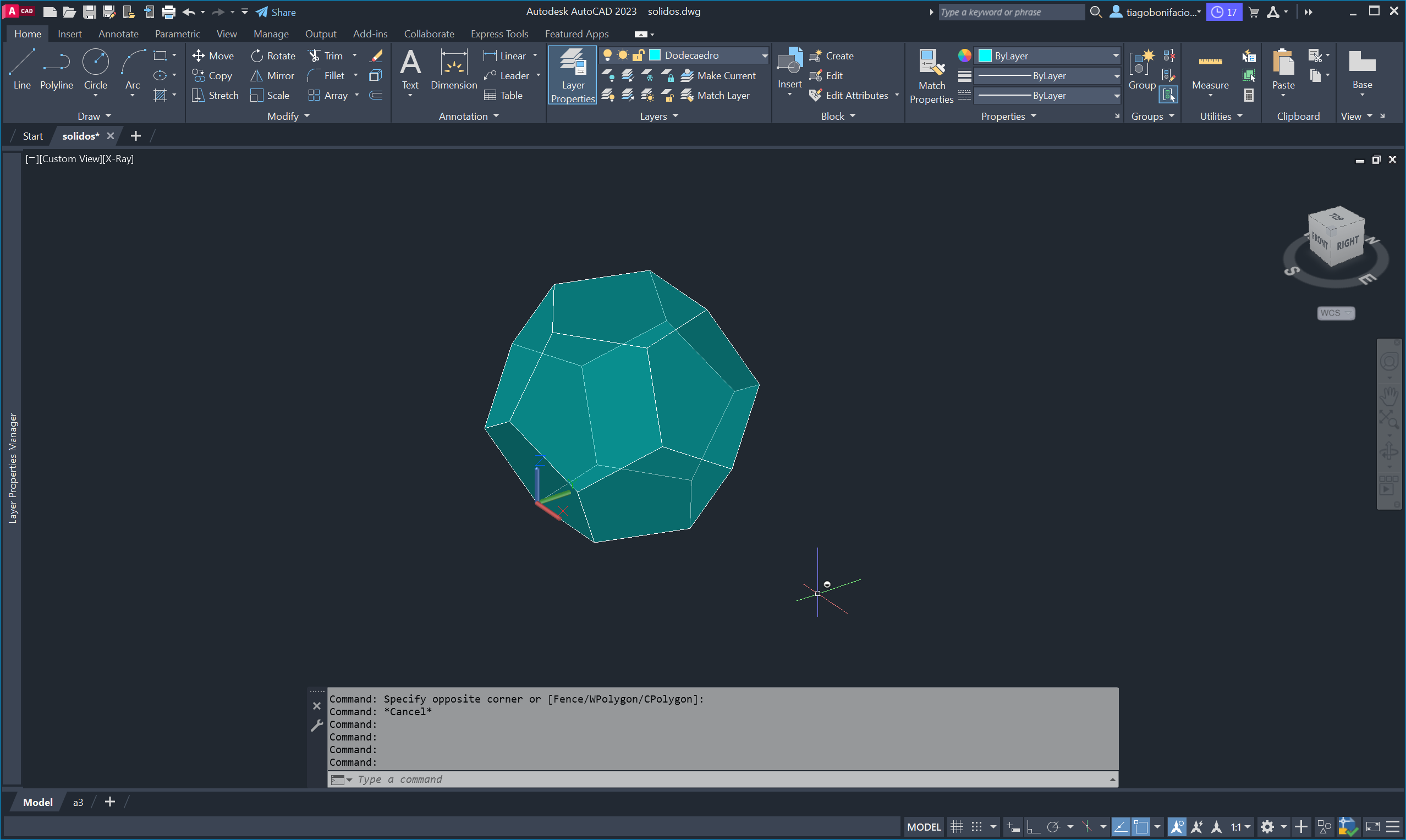A aula iniciou com a limpeza do ambiente de trabalho através do comando LAYDEL para deletar layers desnecessários do layout. Posteriormente, focámo-nos na construção de sólidos platónicos, começando pela criação de um cubo, seguido de um tetraedro e finalmente um octaedro.