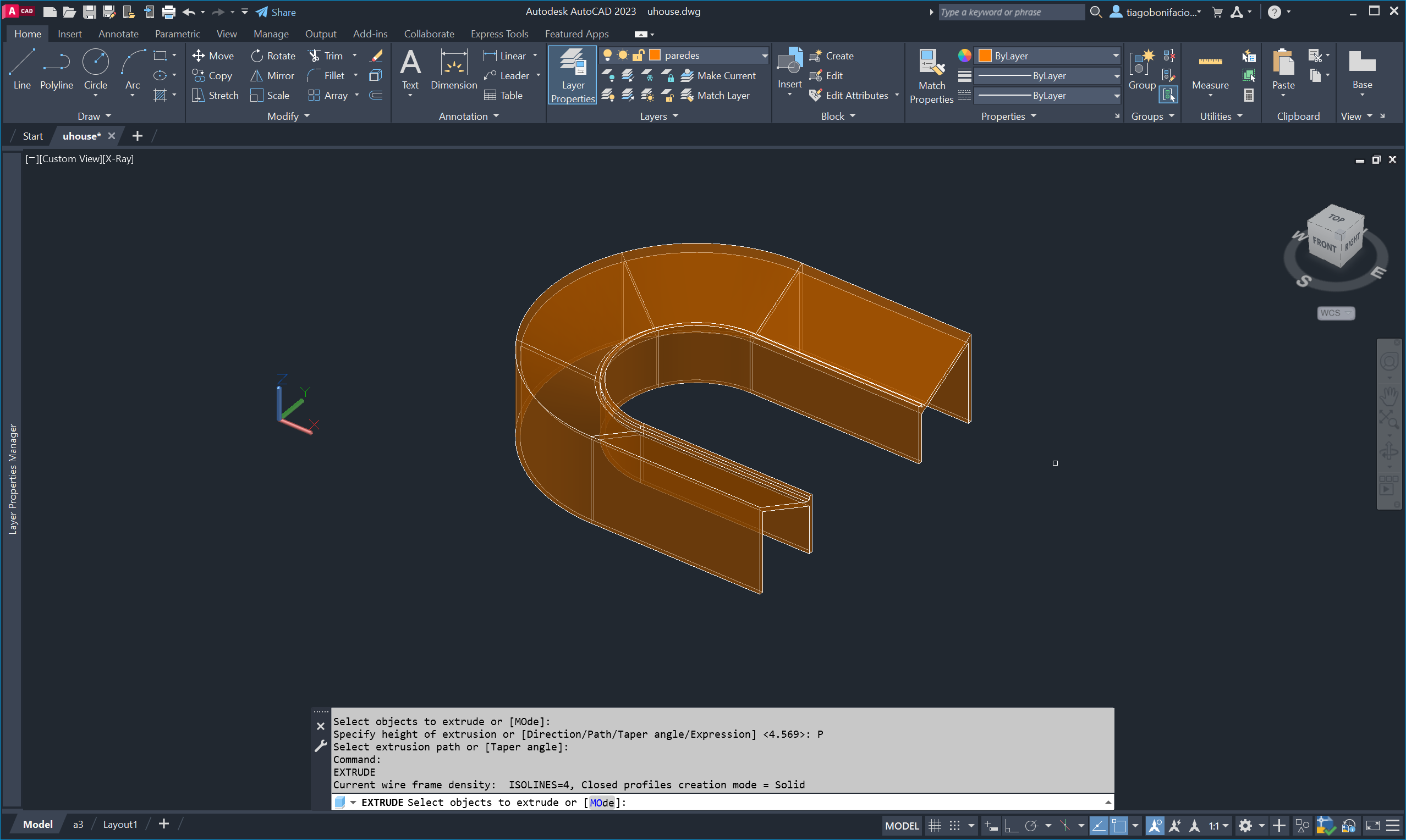 Aplicámos o comando EXTRUDE às polylines do contorno do edifício para criar o volume tridimensional.
