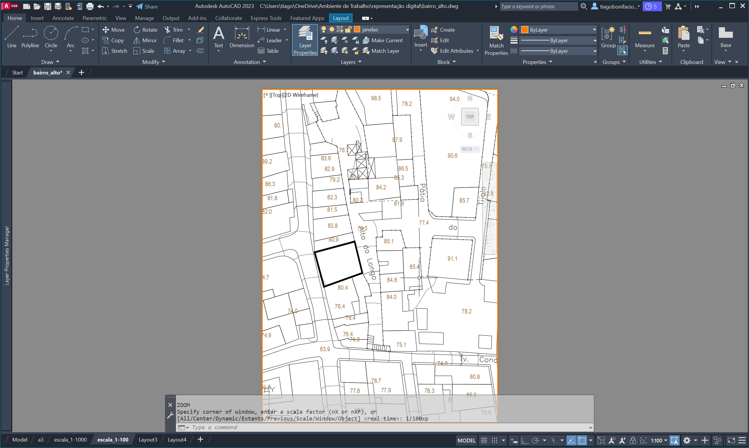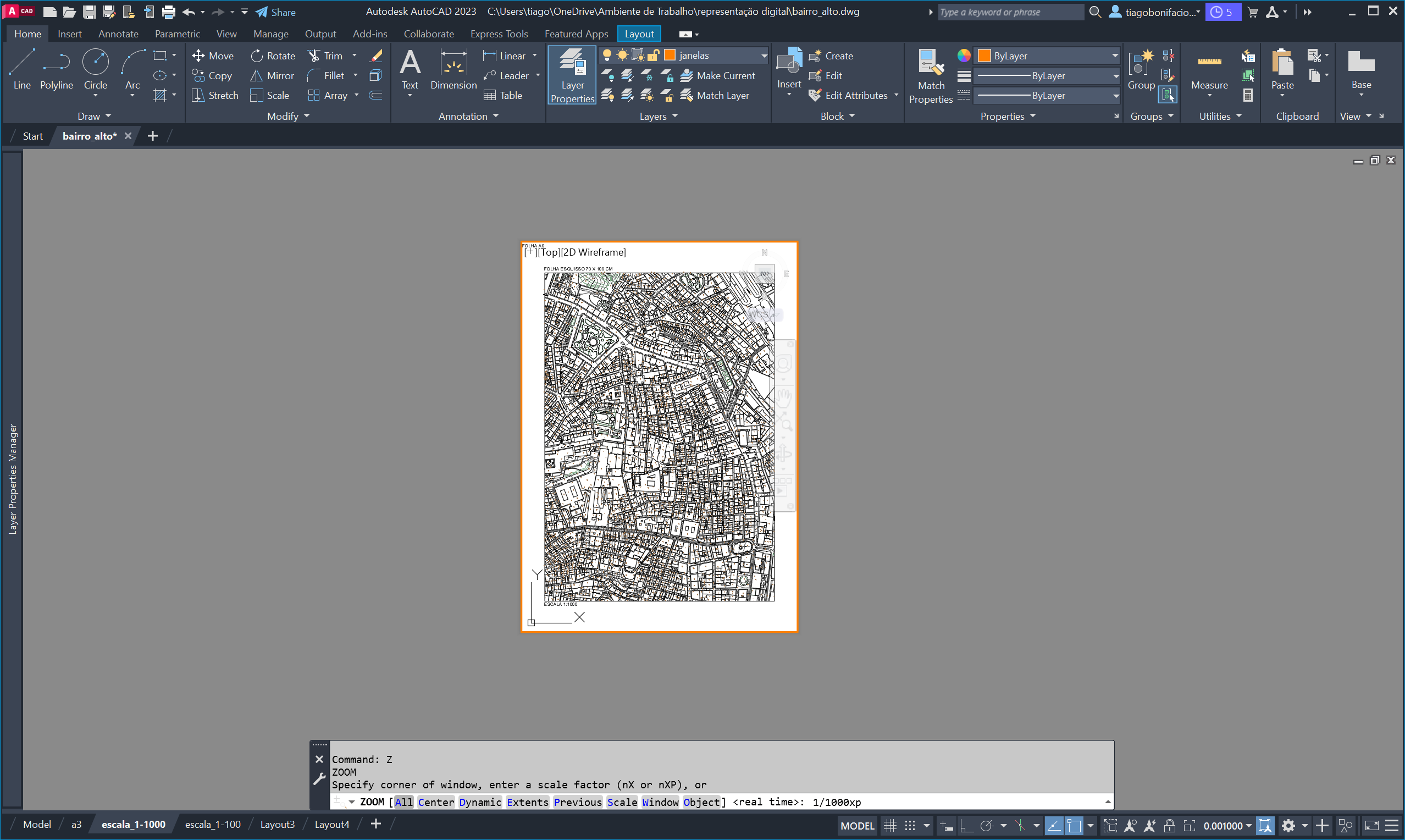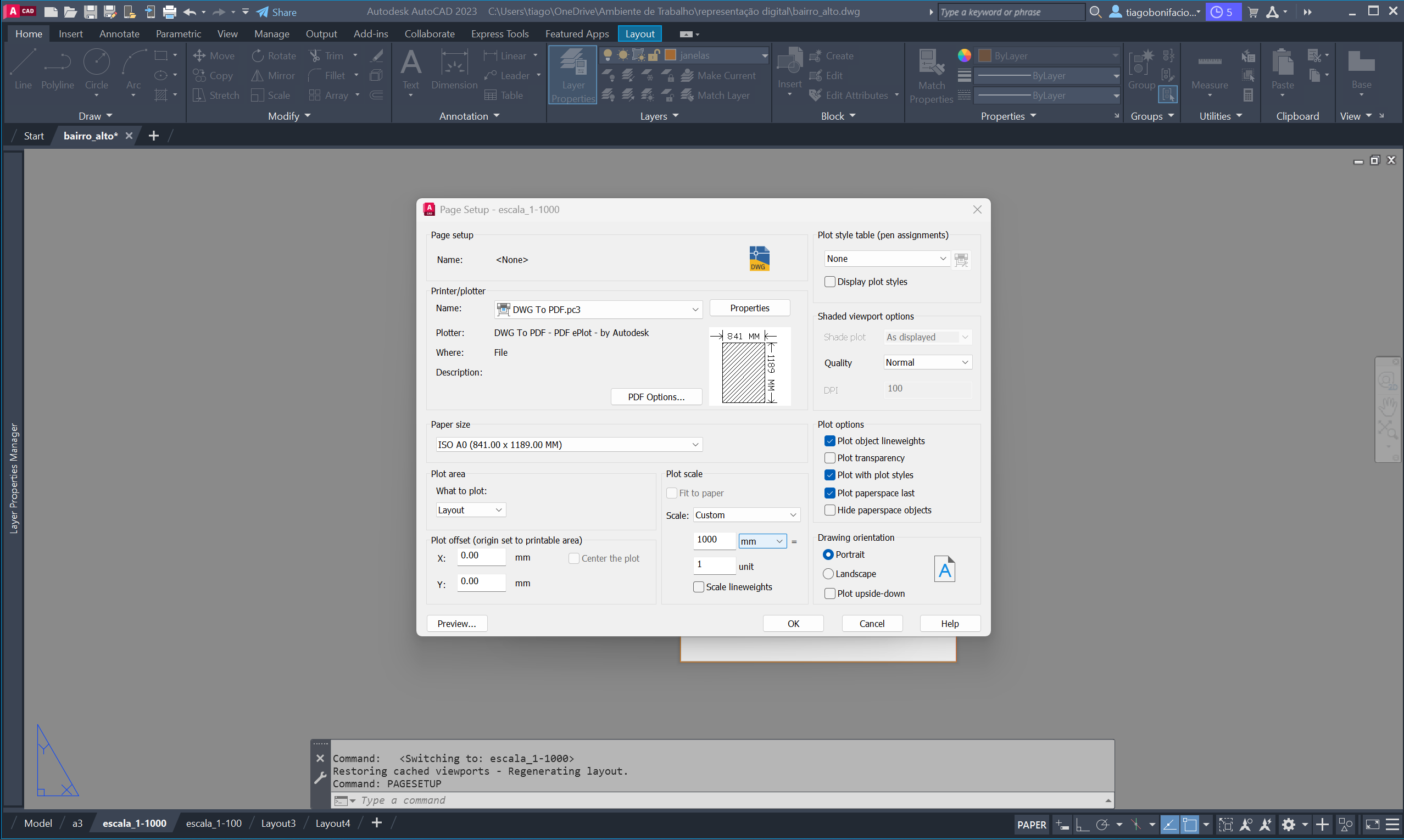 No Layout, criámos folhas A0 sem margem em formato vertical com viewports nas escalas 1/1000 e 1/100.