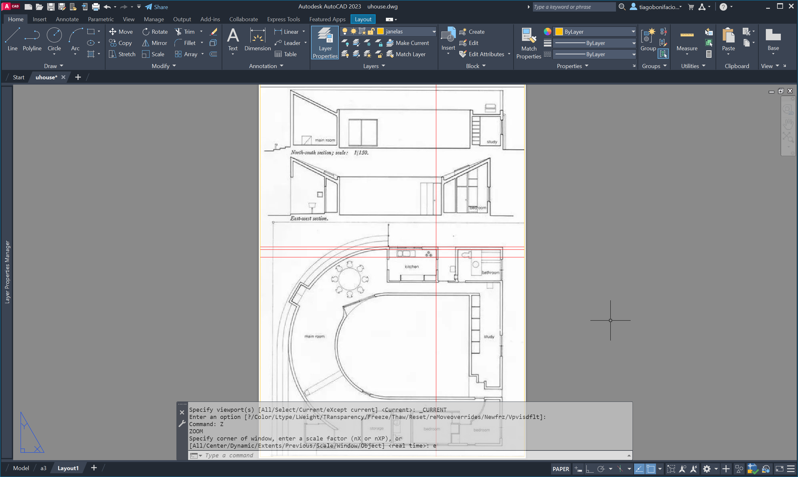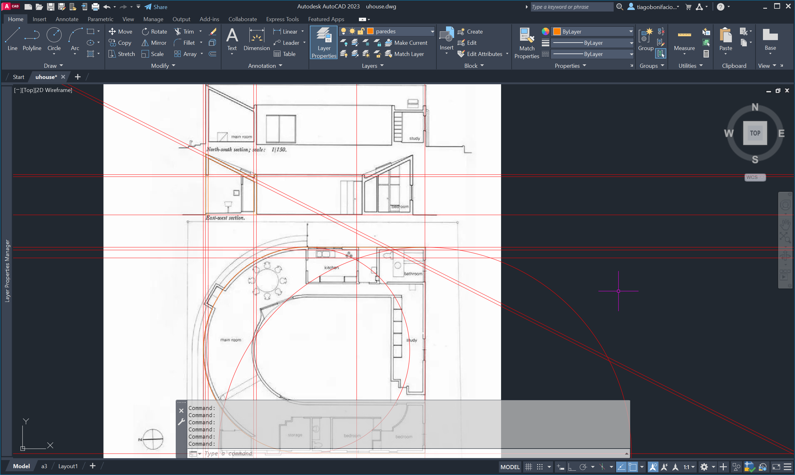 Nesta segunda aula da semana trabalhámos com a planta da casa uHouse, criando linhas auxiliares (XL) e círculos para estruturar o desenho.