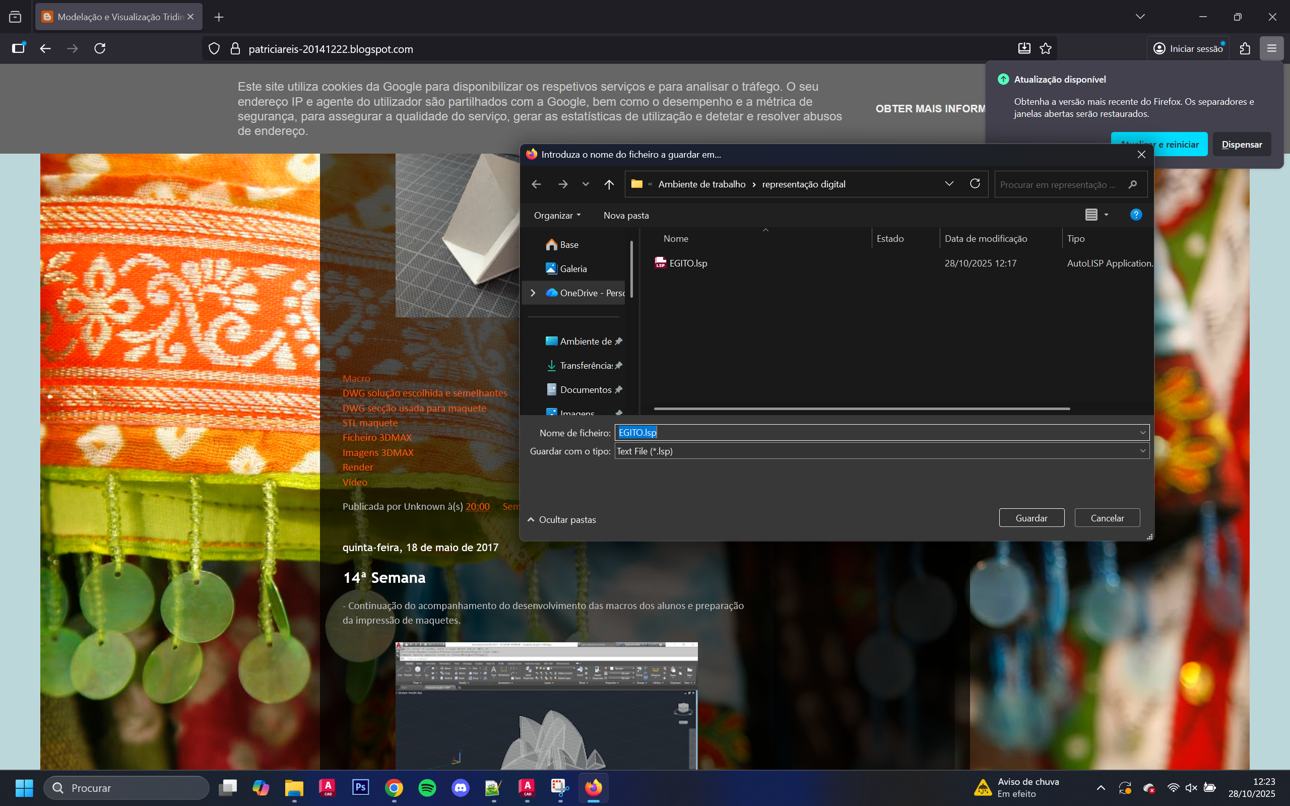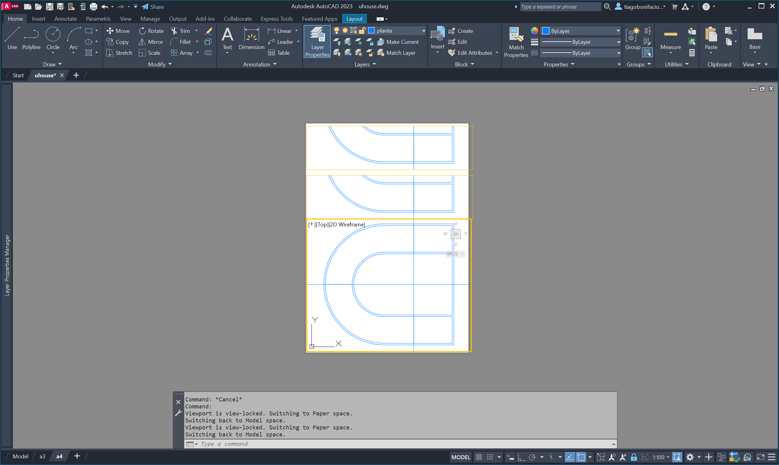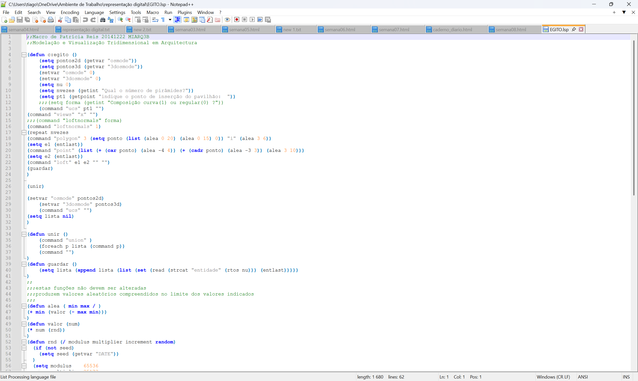 Na aula, concluímos as plantas e cortes da casa Uhause, inserindo-os no Paperspace onde procedemos ao seu escalamento através dos comandos MV e Zoom. Aplicámos lock nas janelas para fixar as viewports e garantir a estabilidade da apresentação. De seguida, explorámos a criação de triângulos utilizando uma macro disponibilizada no site da colega Patrícia Reis (https://patriciareis-20141222.blogspot.com/). Após o download da macro, carregámo-la no AutoCAD através do comando APPLOAD e desenvolvemos vários protótipos tridimensionais. Utilizámos o comando SECTION para gerar plantas, cortes e alçados dos objetos/pavilhões criados. Aplicámos o comando EXPLODE para decompor os objetos em linhas individuais, facilitando a sua análise e manipulação. No final da aula, trabalhámos com hipérboles, explorando formas geométricas mais complexas e as suas aplicações em representação digital.