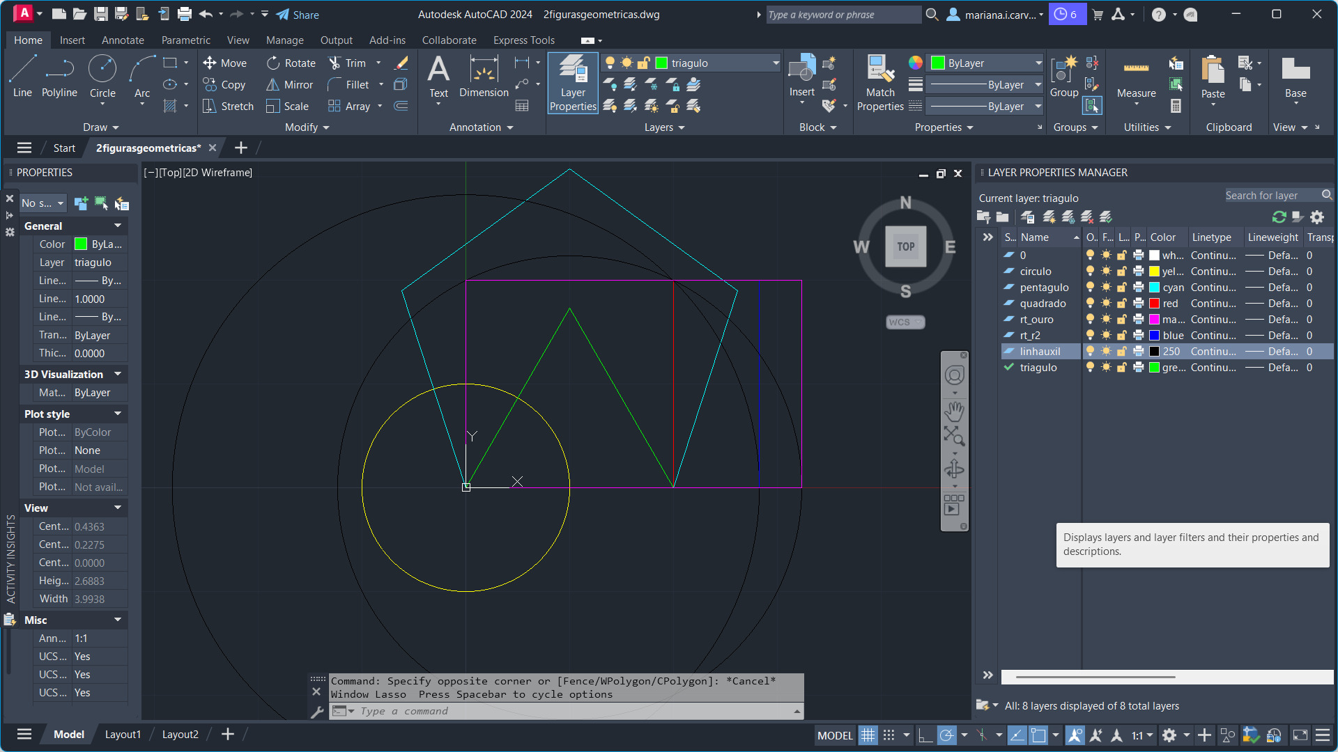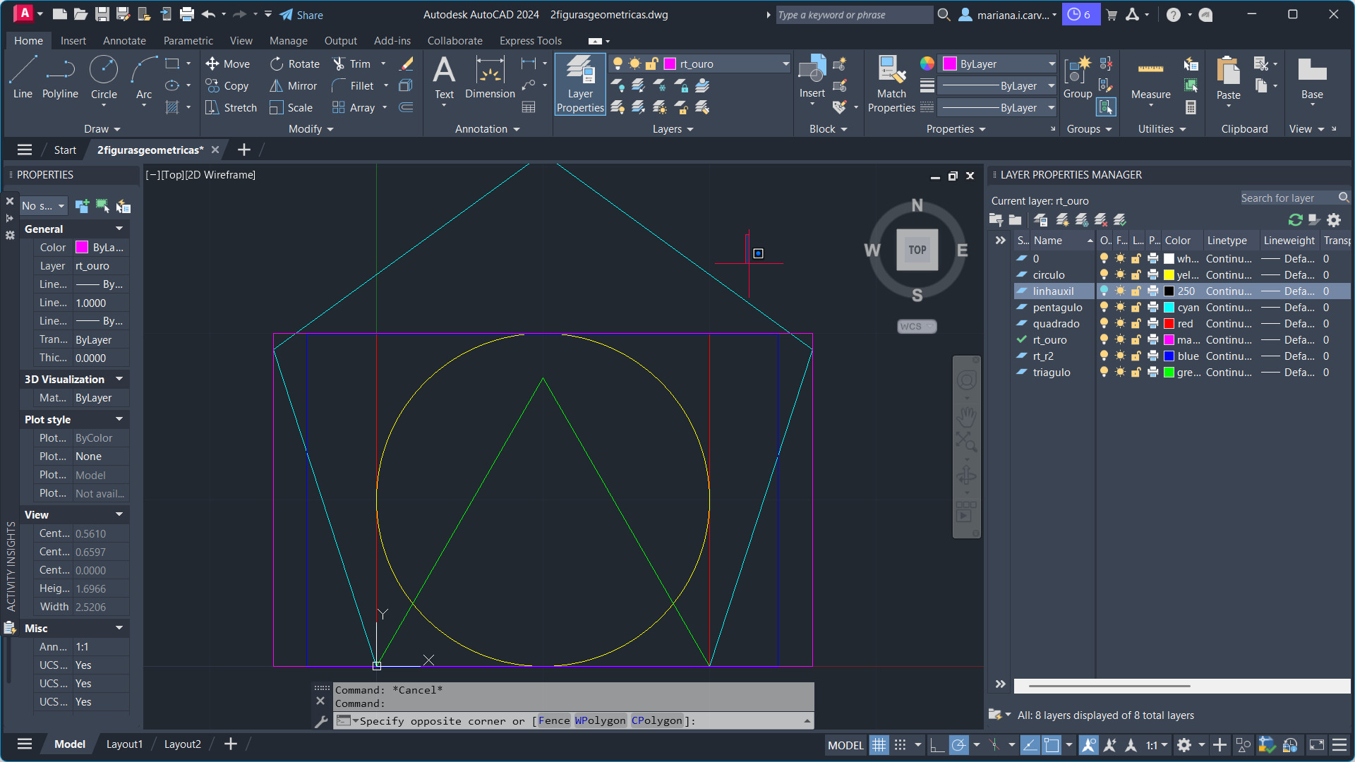 Continuação do exercício das figuras geométricas, transformando e executando as mesmas através de translações tendo em conta os seus centros utilizando comandos tais como circle com referêcia em 3 pontos, move e erase. .