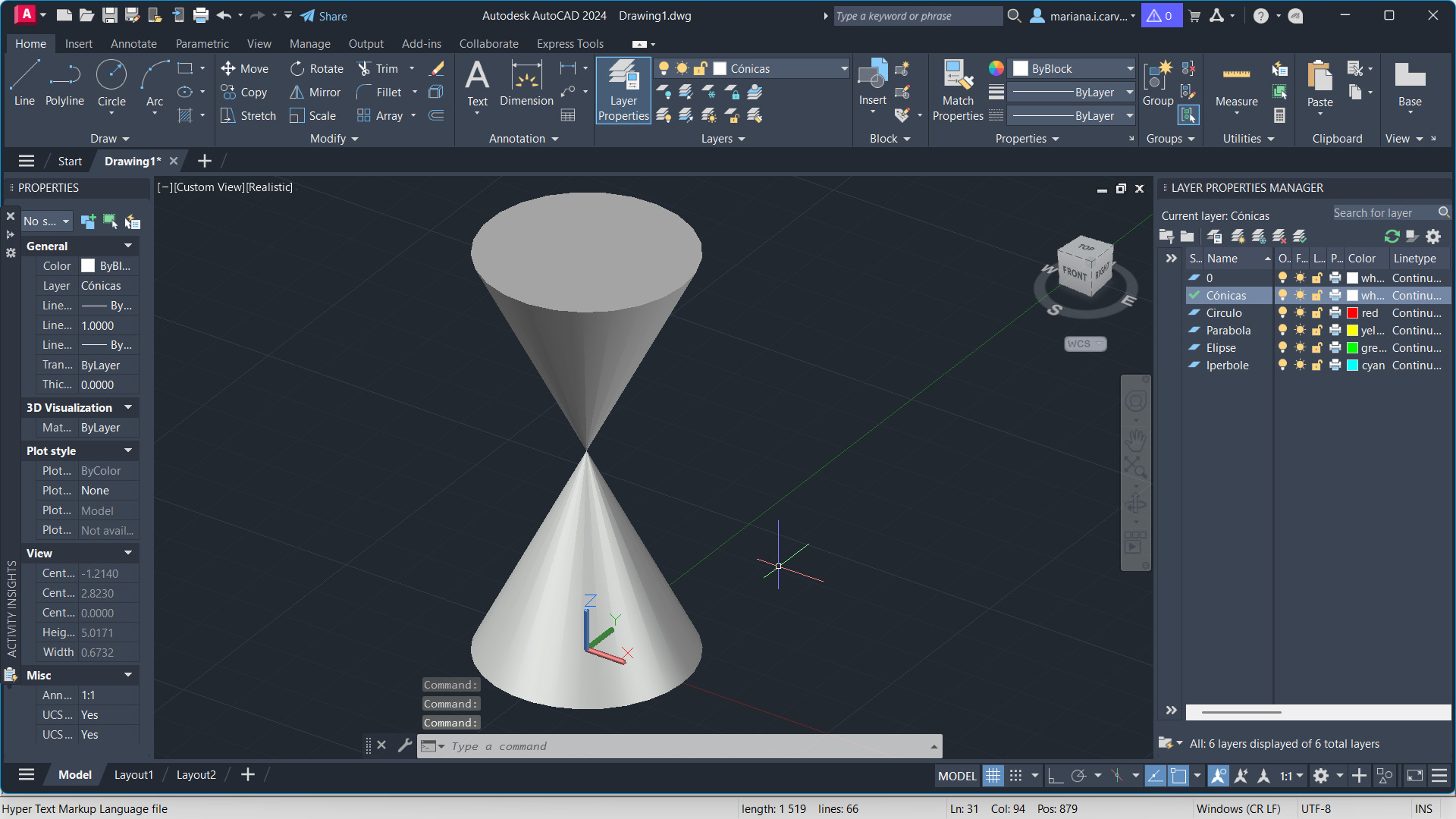 Execução de dois cones através do comando Cone de forma que os mesmos formem simetria (utilização coordenadas positivas e negaticas). Concretização de elementos tais como cículo, elipse, parabolé e iperbole, utilizando comandos Ucs para mudar o eixo. Xline de forma a auxiliar e Section, de modo a efetuar um cortar pelo sólido e originar a secção pretendida. Trabalho de coordenadas e sua importâcia de localização (X,Y,Z).