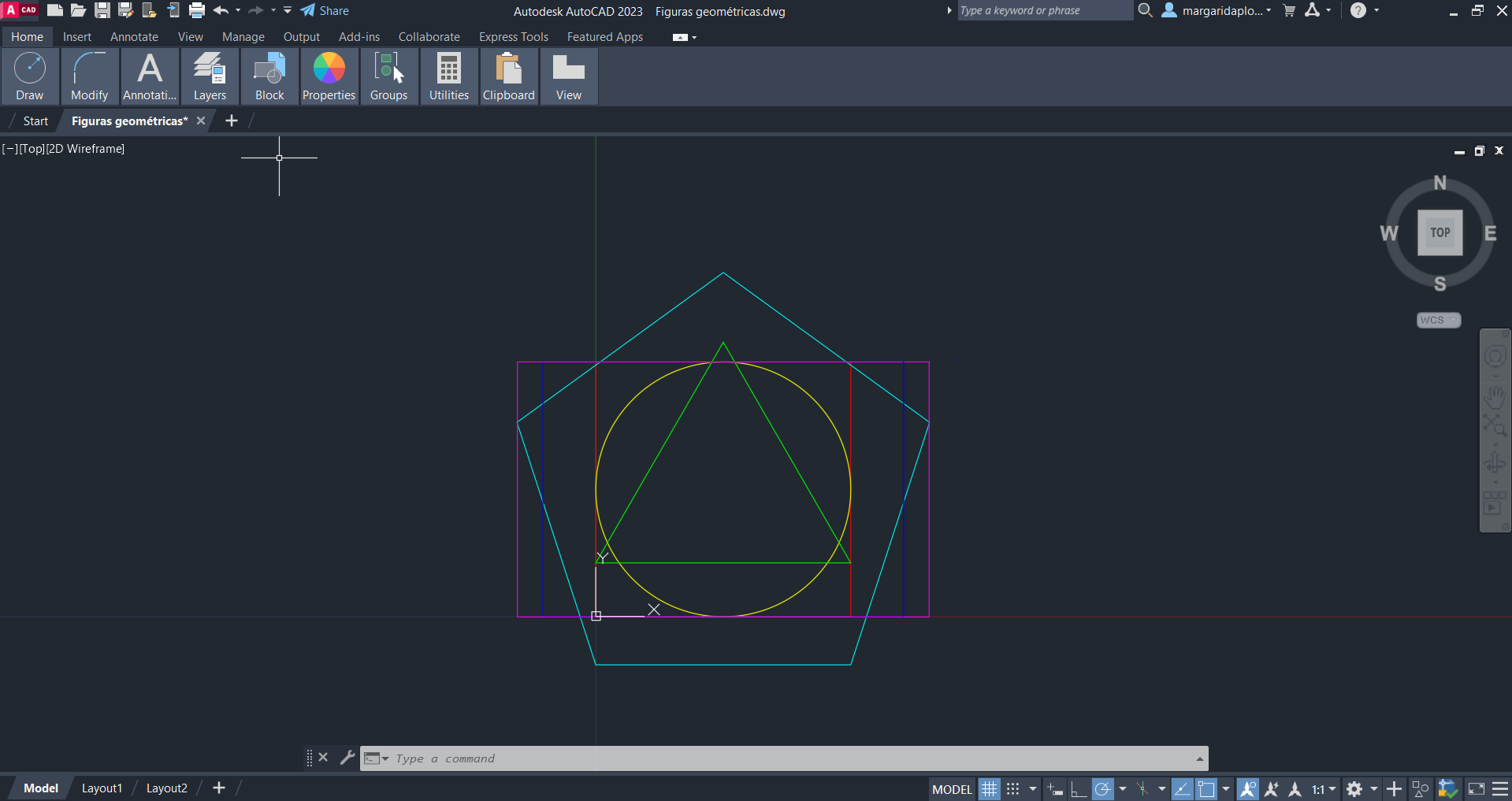Elaboração de vários polígonos em AutoCAD: Quadrado, retângulo, círculo, pentágono e triângulo.