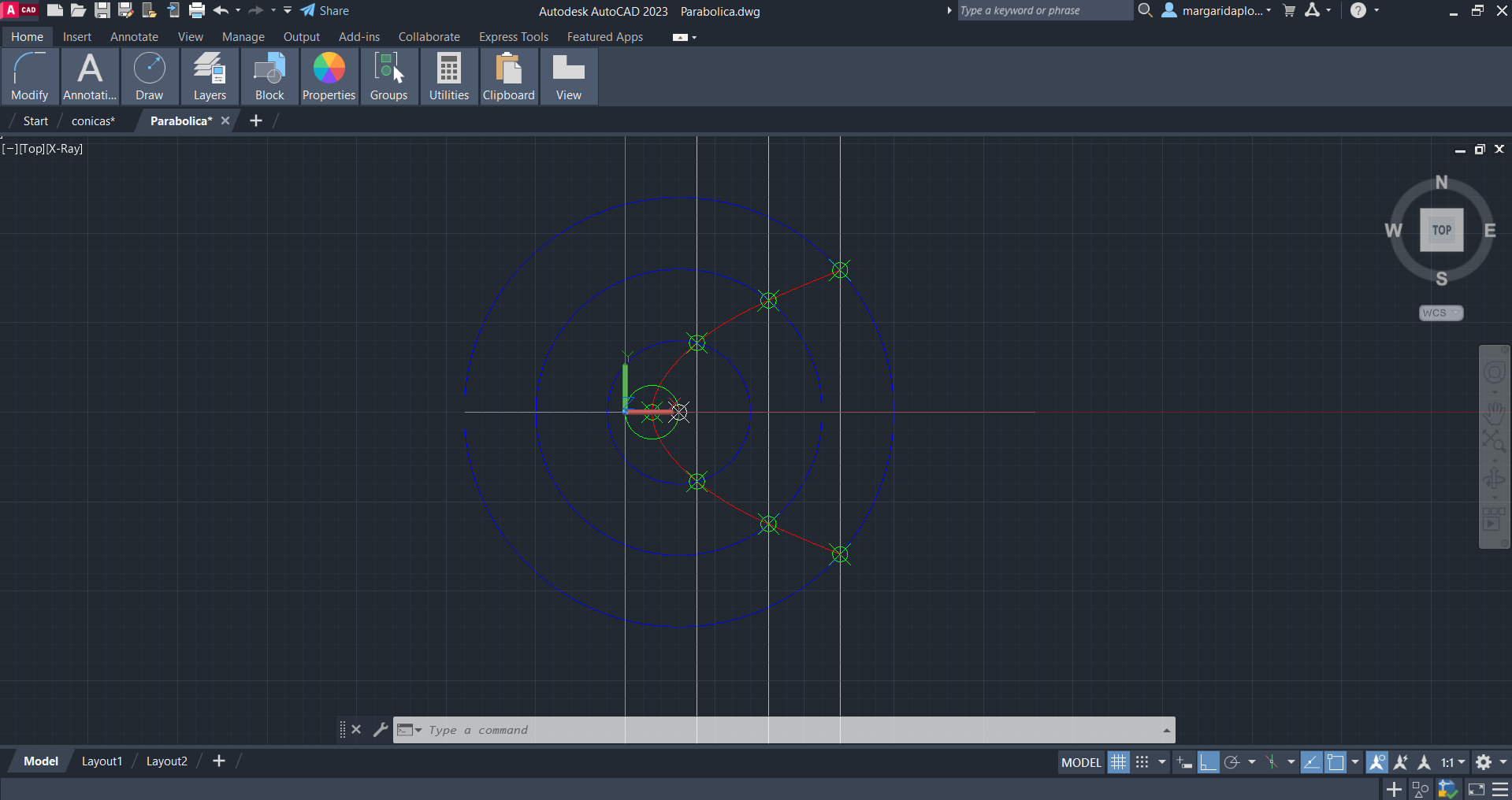 Criação de uma segunda parábola, esta mais rigorosa, através dos comandos "LINE", "CIRCLE", "TRIM", "XLINE", "SPLINE" e "COPY".