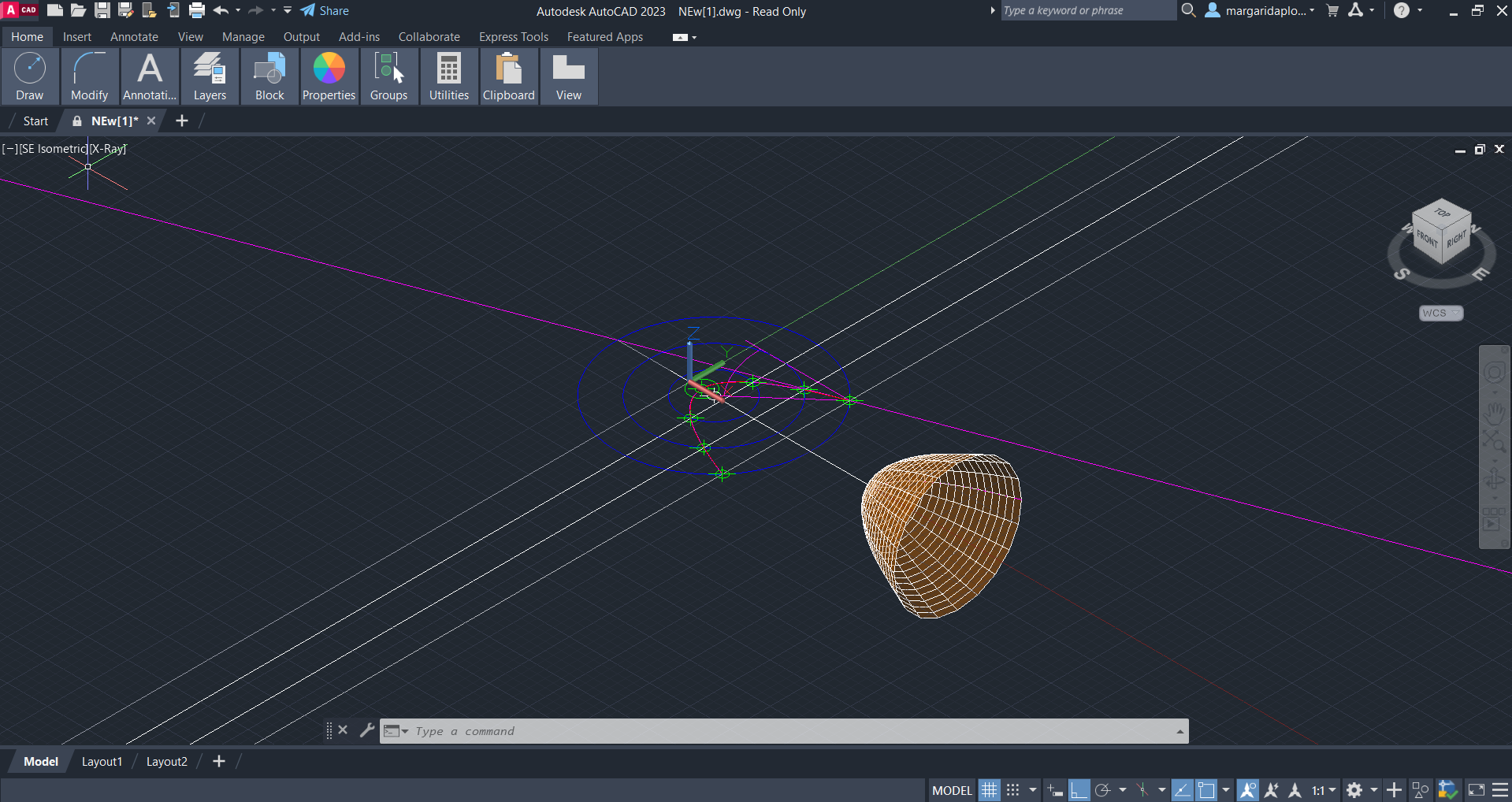 Criação de três secções na figura, uma planta, um corte transversal e um corte longitudinal, através dos comandos "XLINE", "UCS", "SECTION".