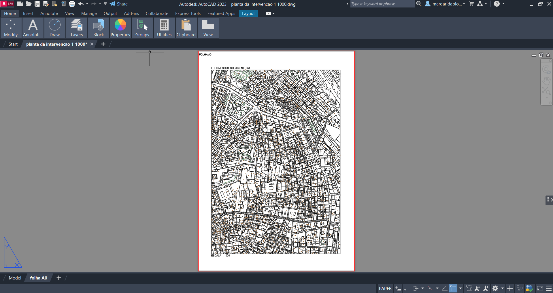 Ajuste da planta a um retângulo com as medidas de um A0 e posteriormente a sua colocação num layout A0 e mudança da escala, através dos comandos: RECTANG, SCALE, PAGESETUP, MVIEW e ZOOM.