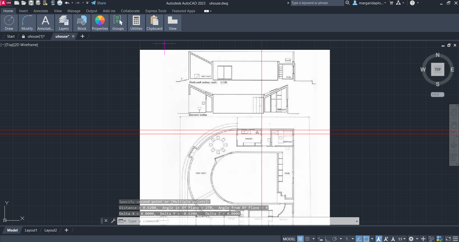 Após descarregar e anexar a imagem de planta e cortes com o comando "ATTACH", esta foi escalada a partir dos comandos "XLINE", "SCALE", "ZOOM", "DIST" e "OFFSET".