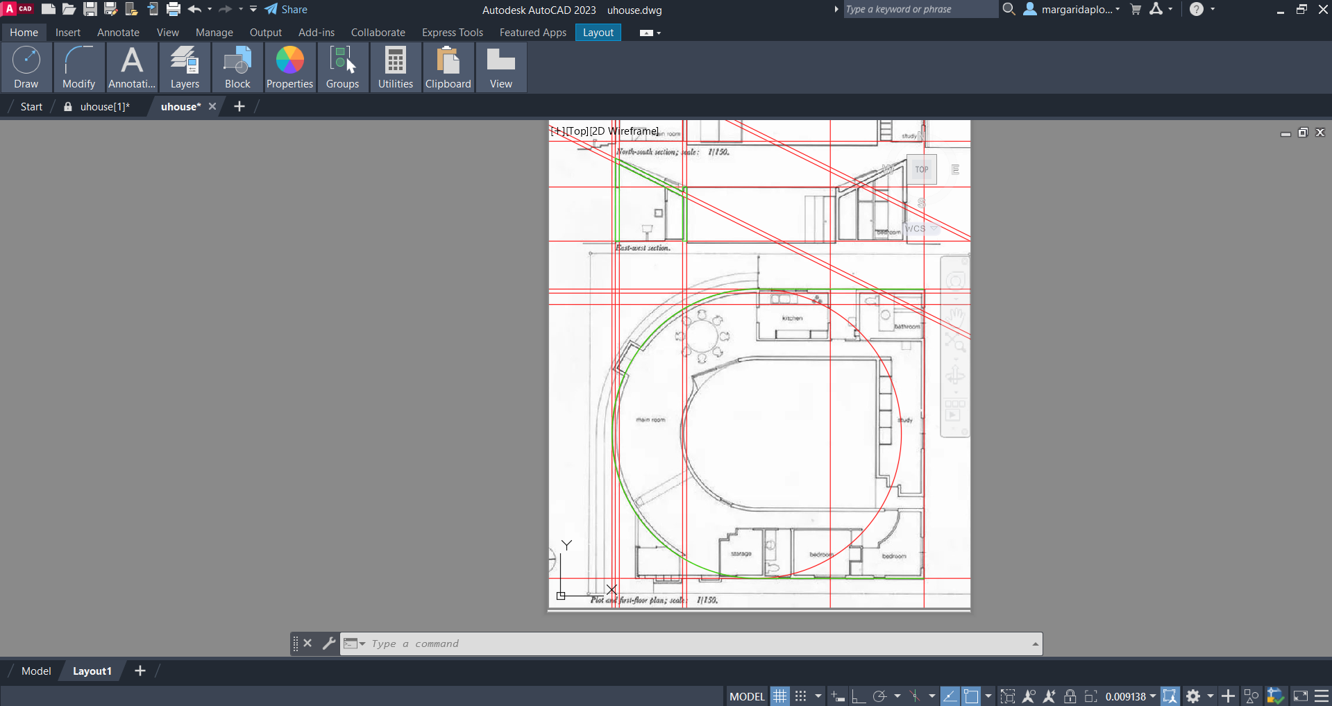 Delimitação da forma da casa através de retas, com o auxílio dos comandos "COPY", "XLINE", "OFFSET", "CIRCLE" e "PLINE".