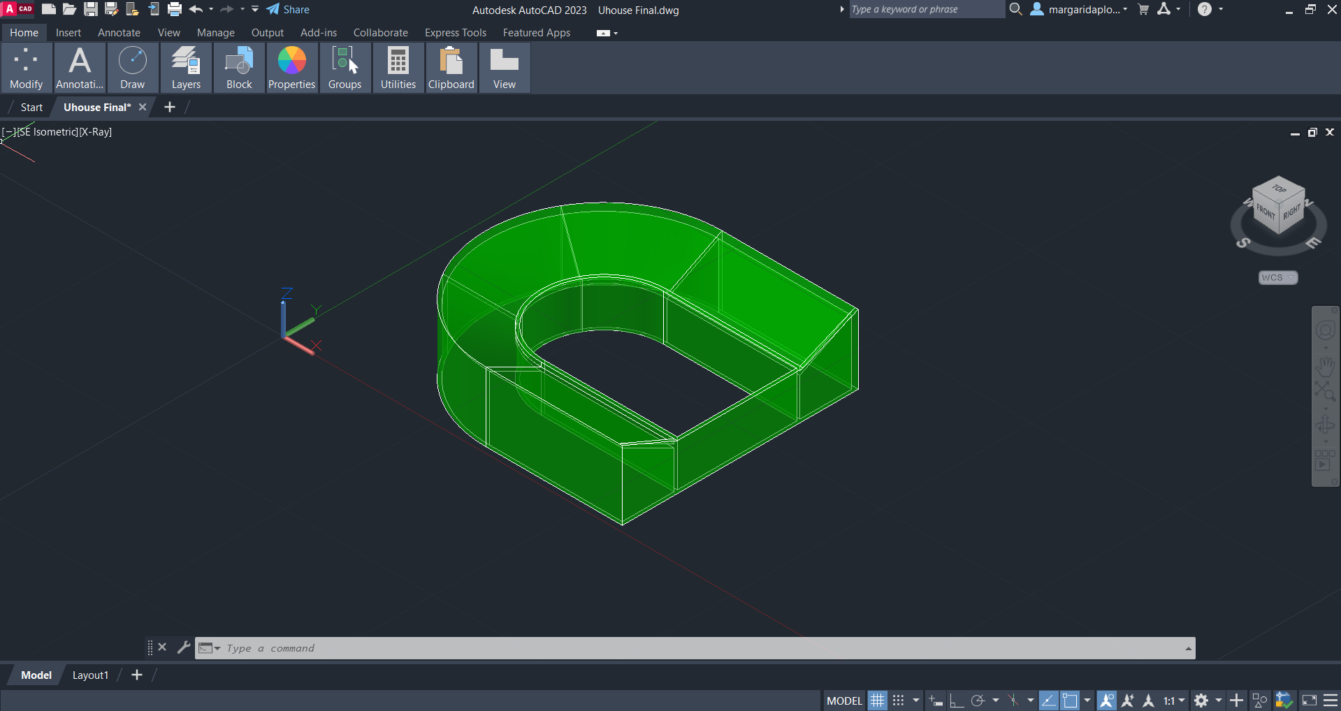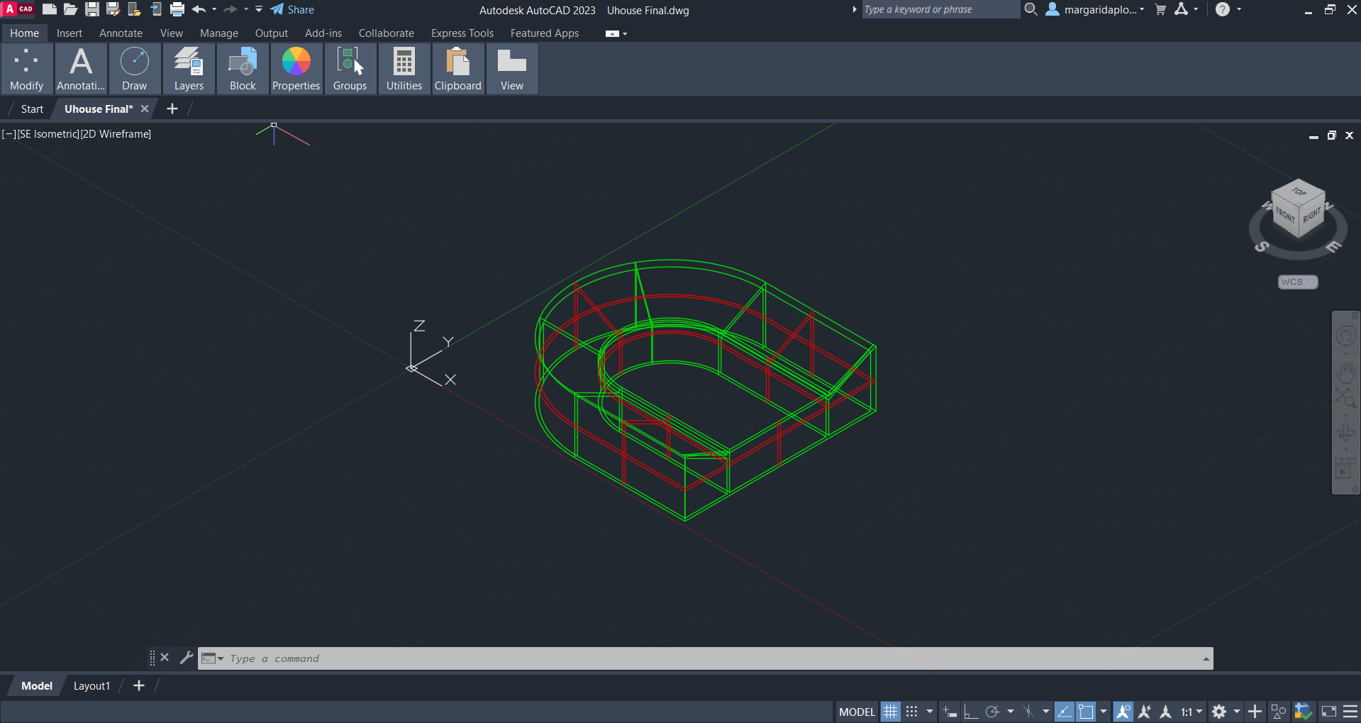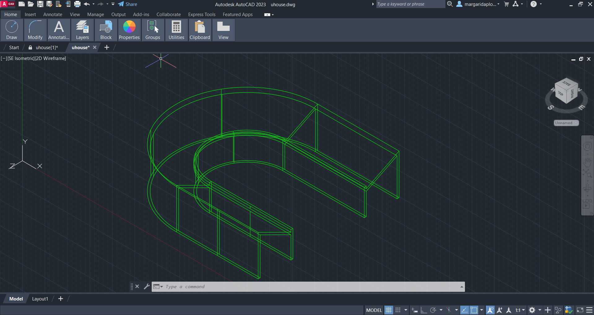 Através da forma da base e de um perfil, criação do formato da casa e fechamento, com a utilização dos comandos "MOVE", "ROTATE", "UCS" e "EXTRUDE".