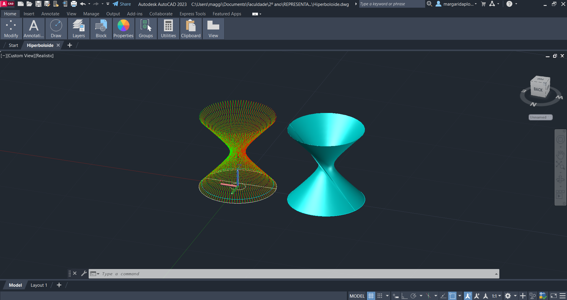 Execução da uma cópia da hiperboloide ao lado da mesma, utilizando o comando "COPY", seguido dos comandos "REVOLVE" e "THICKEN", onde se criou uma espessura de 1 no objeto.