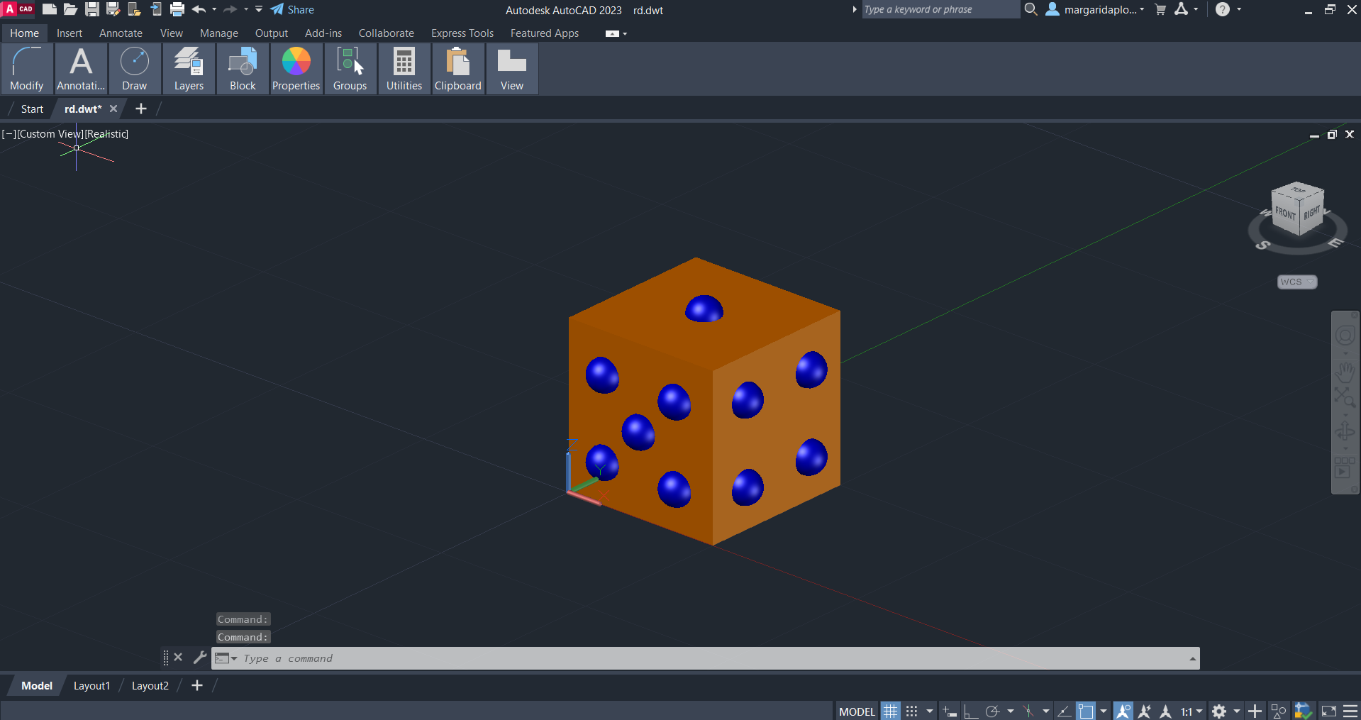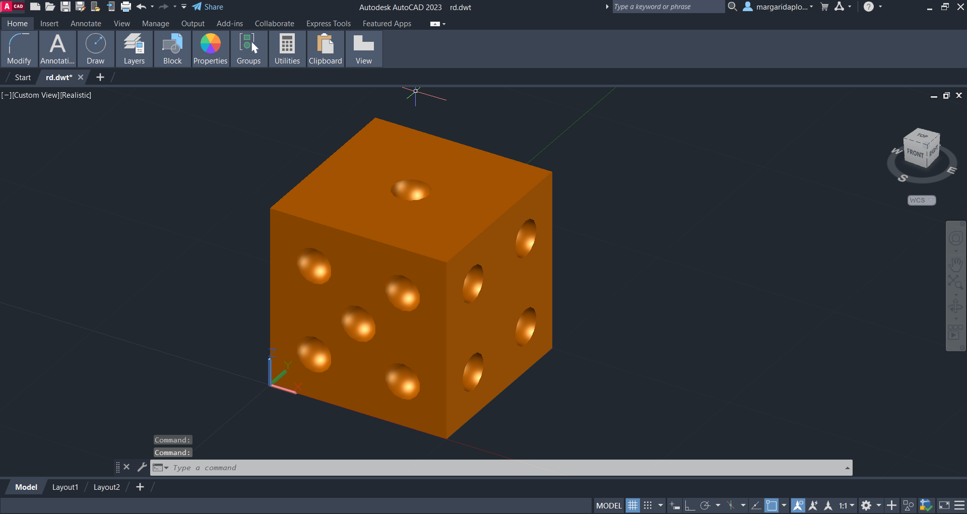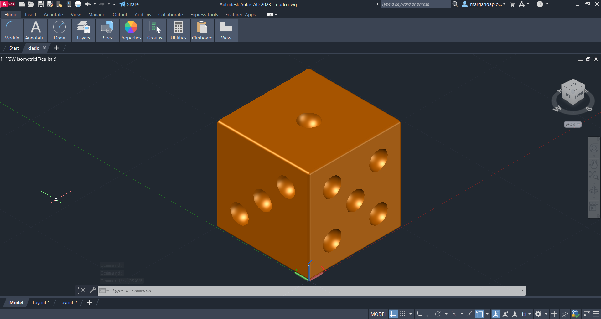 E, para concluir, arredondamento das arestas do dado, a partir do comando "FILLET".