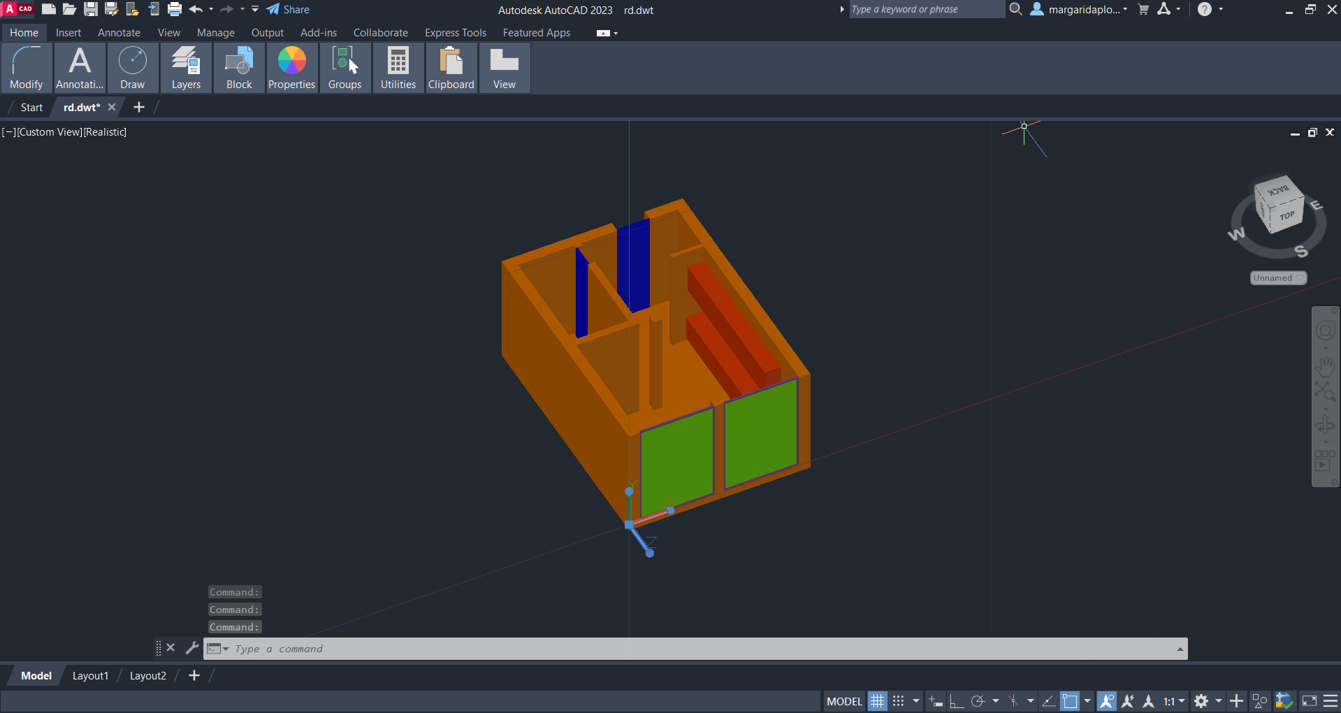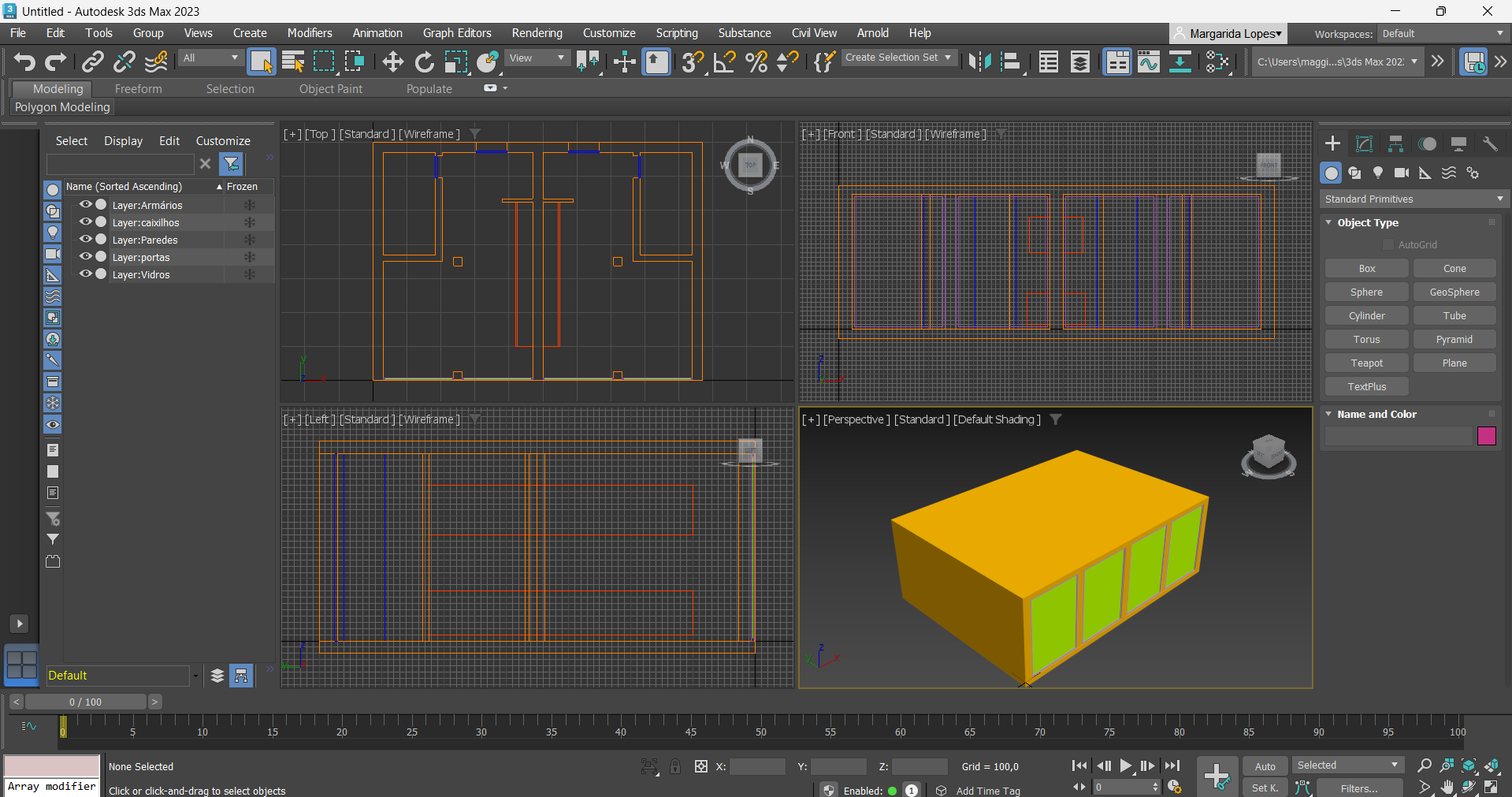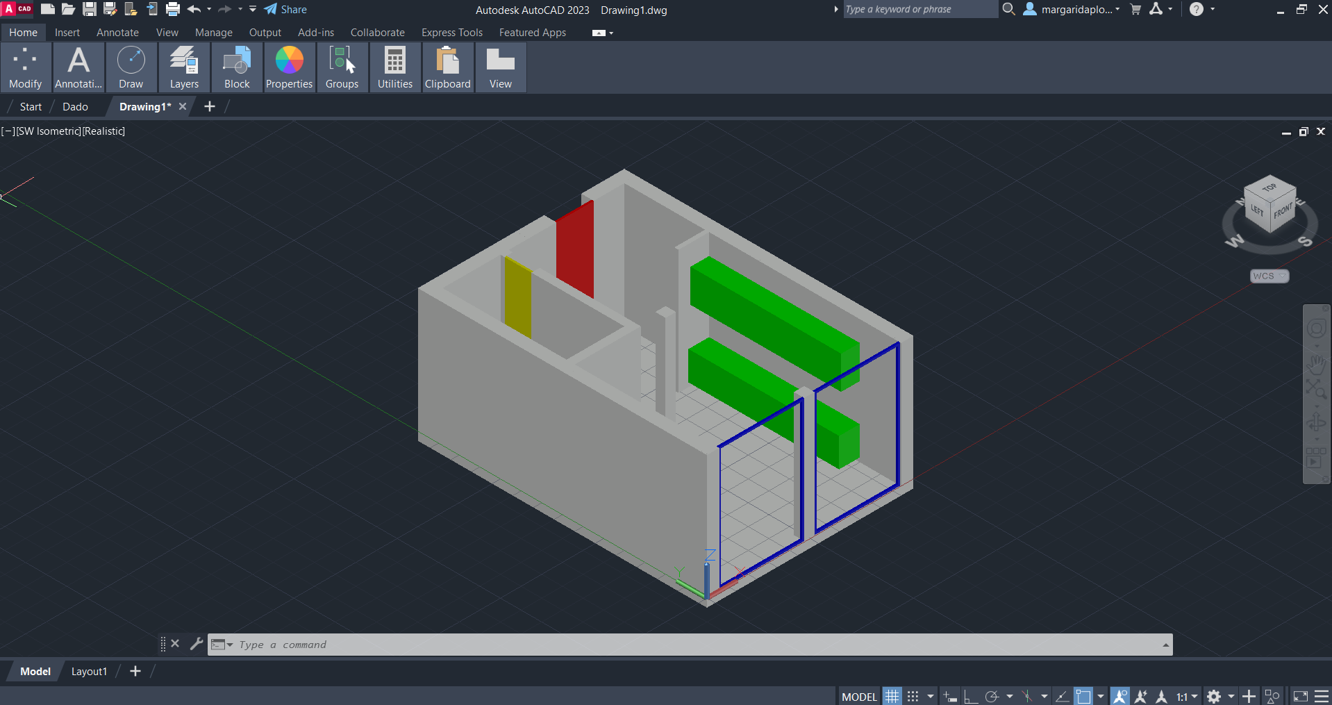 Mudança dos elementos para as suas layers e cores correspondentes nas "PROPRIETIES". Depois, união das paredes e pilares, através do comando "UNION".