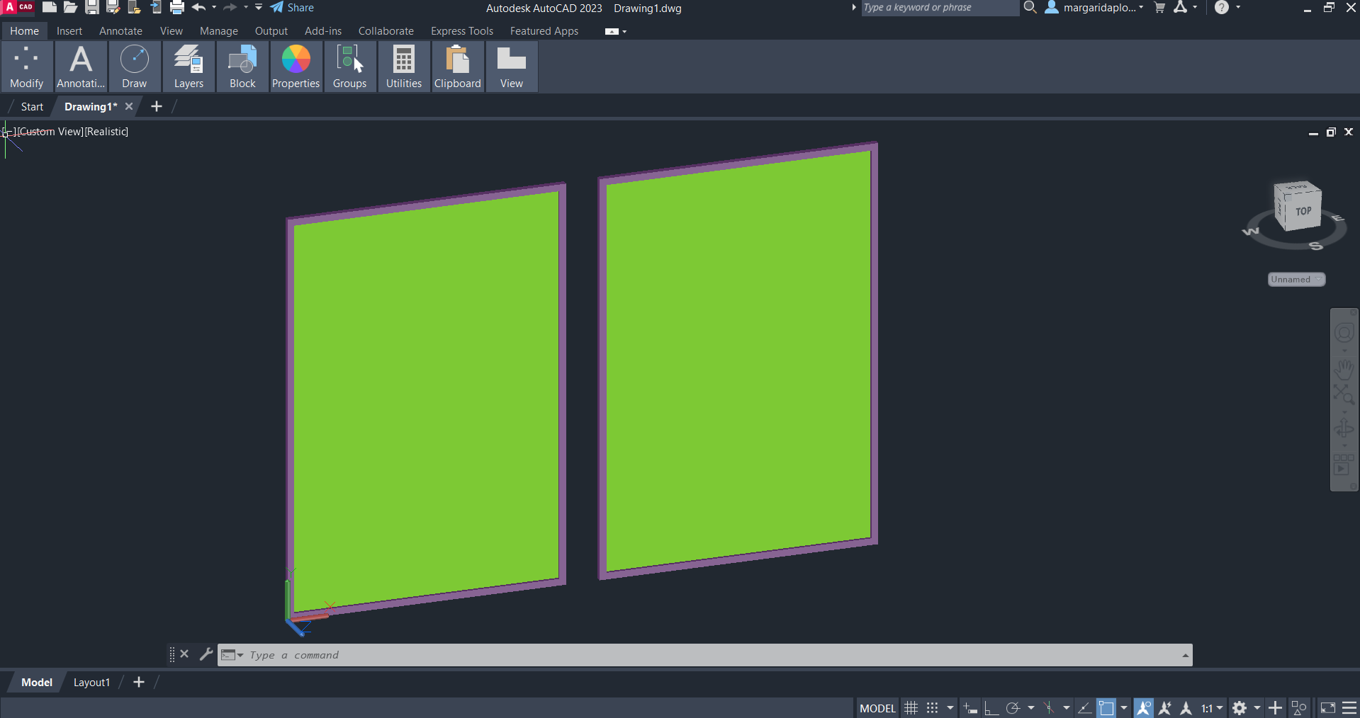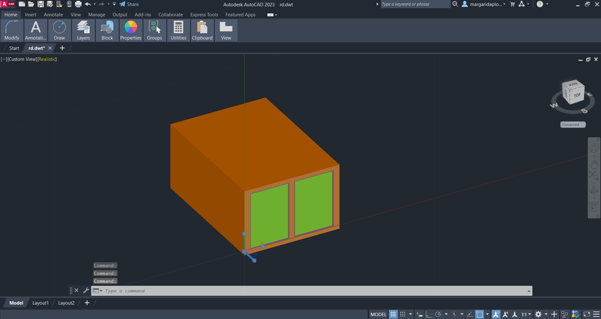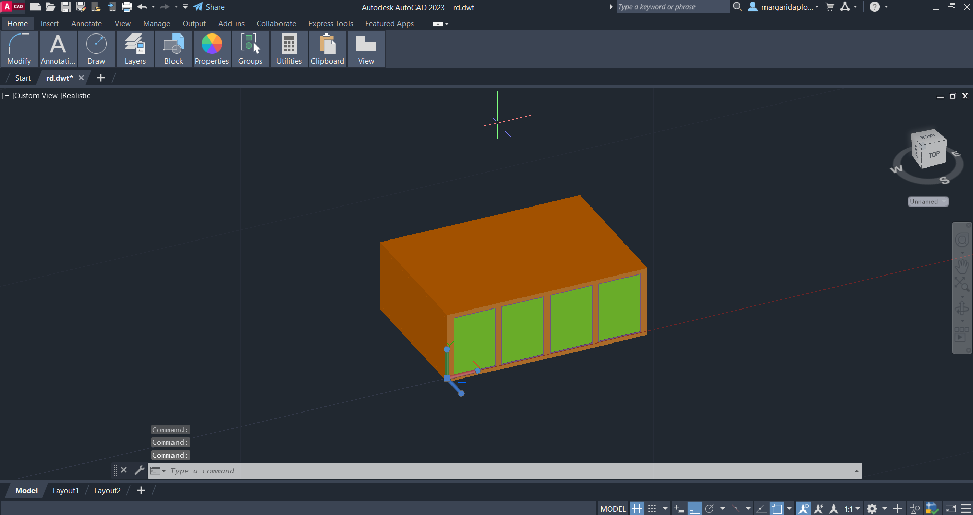Criação de um teto, extensão do T0 para a direita e união das suas lajes e paredes, formando um único modelo, através dos comandos "COPY", "MIRROR" e "UNION".