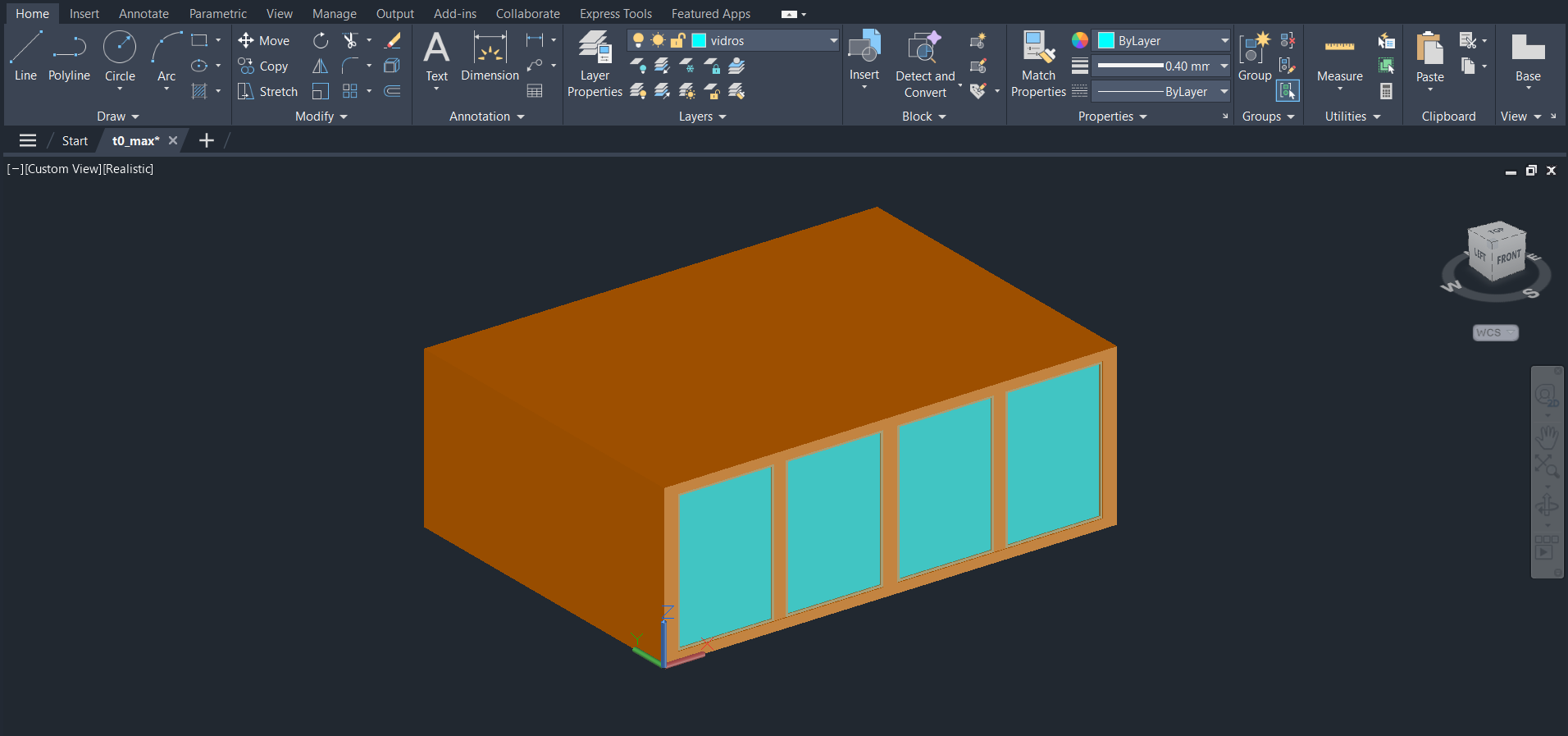 Realização de um novo exercício a partir de um modelo em AutoCad de nome T0. Colocação dos elementos pré-existentes nas respetivas layers e criação de um novo modelo, através dos comandos MIRROR e UNION, entre outros.
