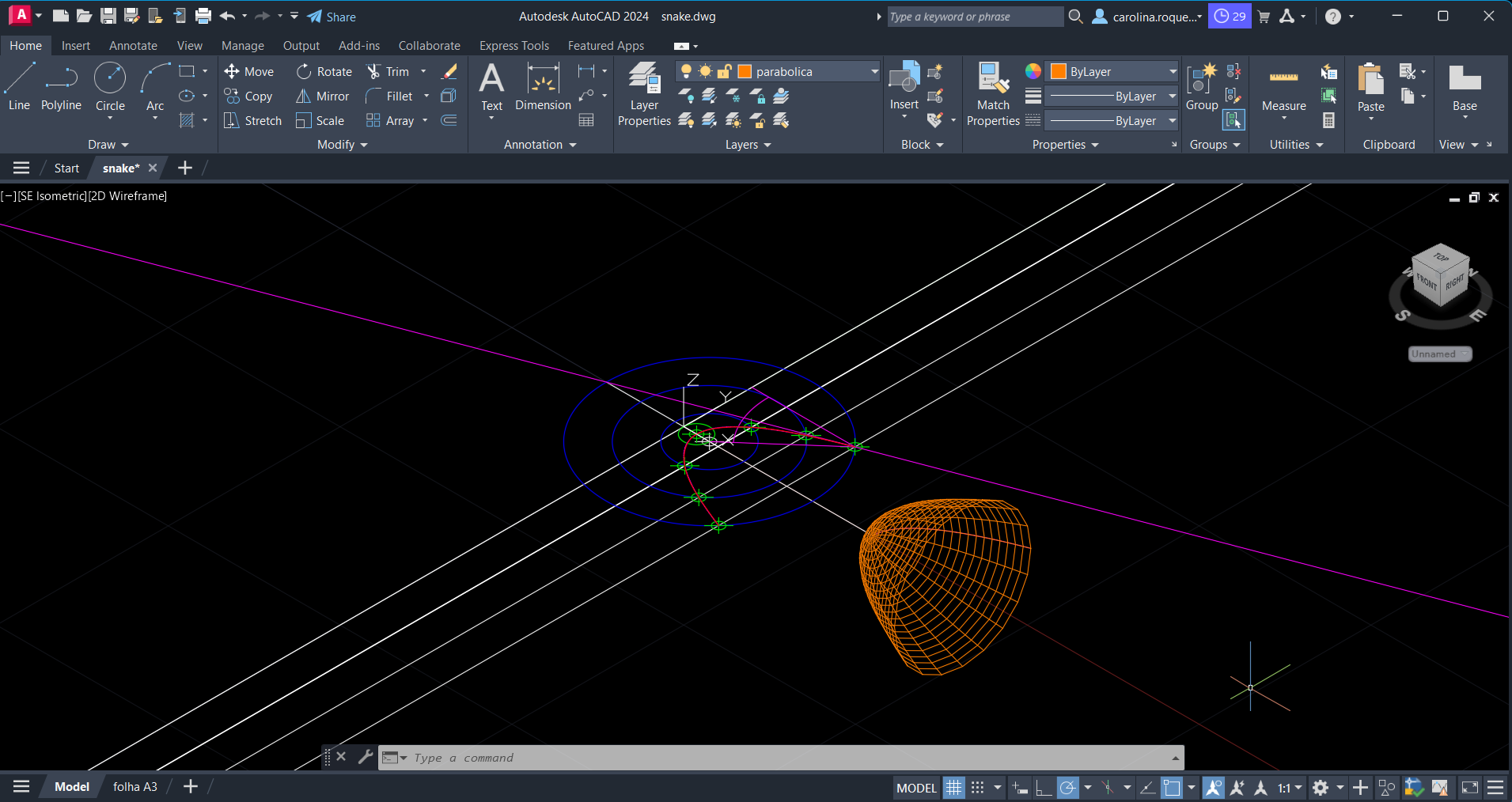Conclusão do exercício da aula anterior, intitulado Parábola . Com os comandos "LINE", "CIRCLE", "TRIM", "XLINE", "SPLINE", "COPY", "SURFTAB 1", "SURFTAB 2" e "REVSURF" realizámos o trabalho.