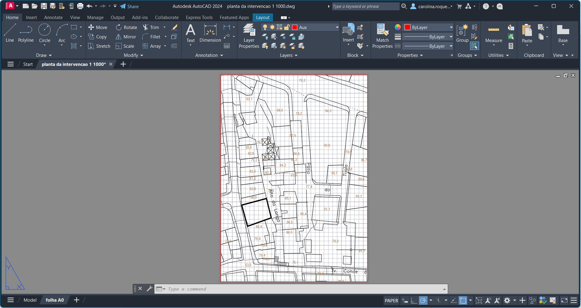 Análise e treino de uma planta 1:1000 , planta esta de intervenção, no Bairro Alto, para a cadeira de projeto para saber como importar imagens para o AutoCad, como mudar a sua escala e como colocar numa folha de trabalho, neste caso A0.