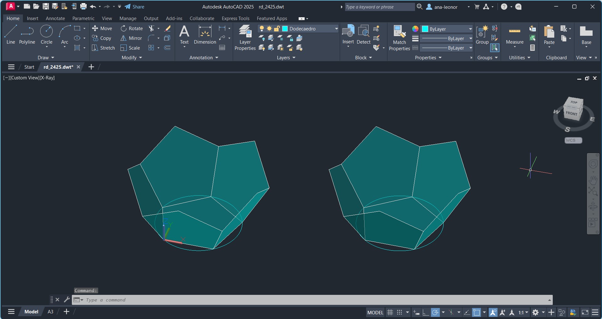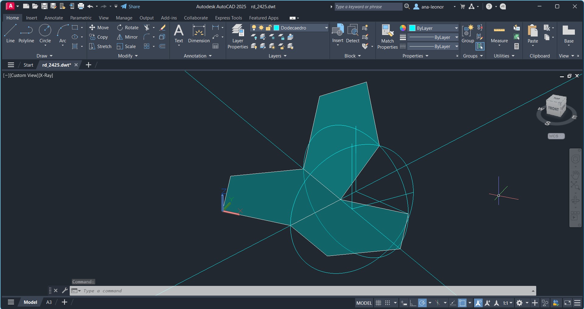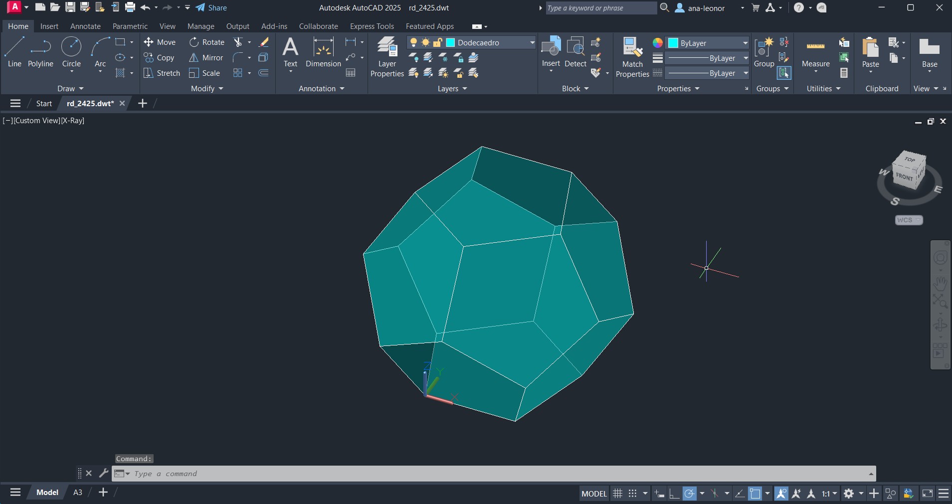 Uso de comandos auxiliares como XLINE e LINE, para a simular a planificação real do Dodecaedro.