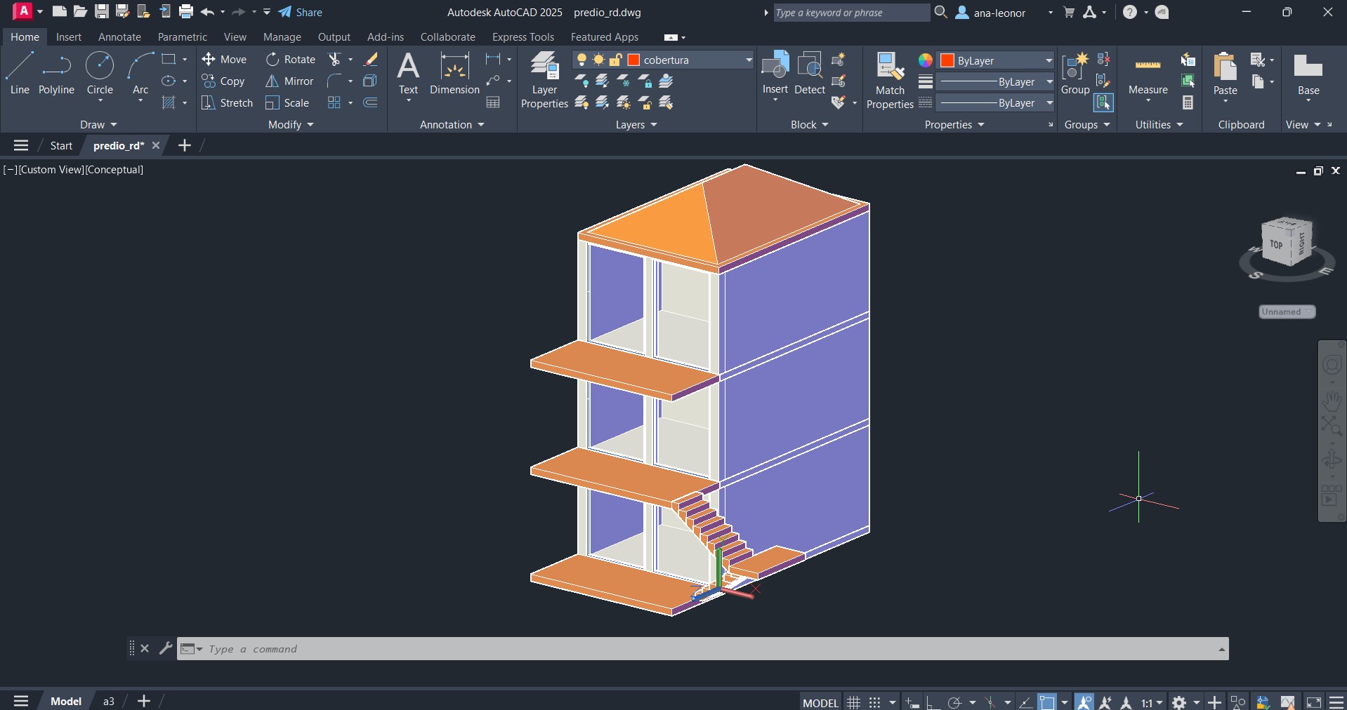 Criação de uma cobertura para a volumetria, através dos comandos RECTANG e EXTRUDE.