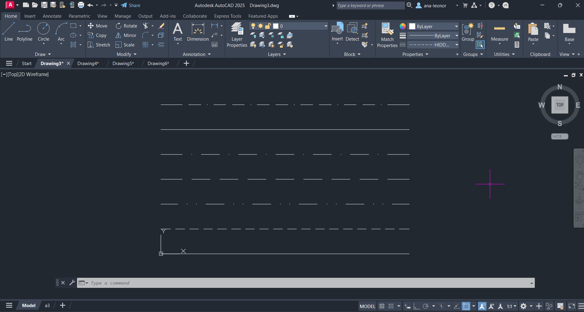 Representação de diferentes "tipologias" de linhas, através do comando LINETYPE (no qual fez se a seleção das linetypes