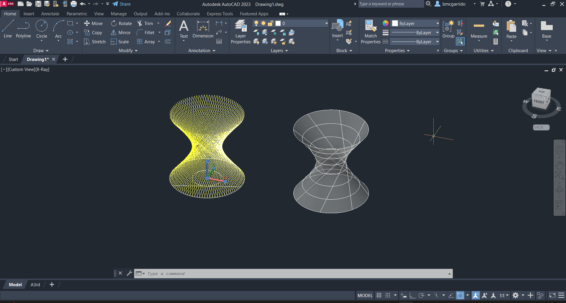 Criamos uma superfície hiperbólica com dois métodos diferentes e ainda uma superfície contínua através da geratriz da outra superfície.