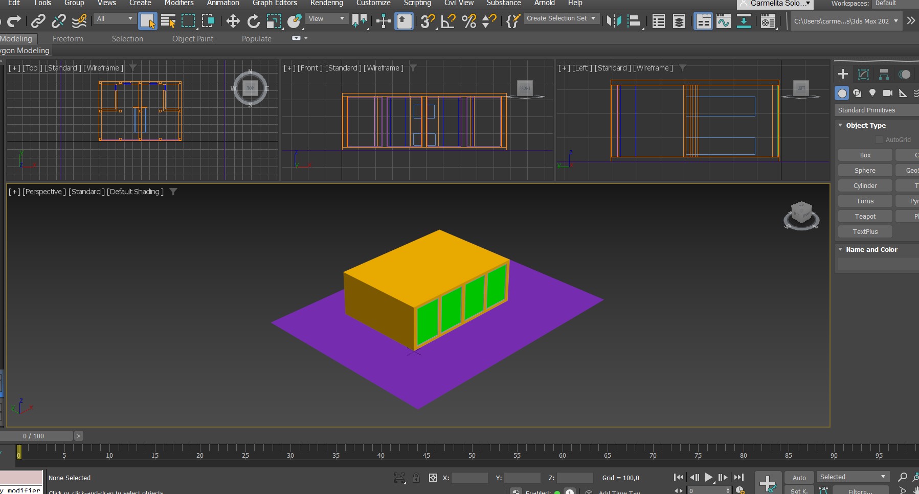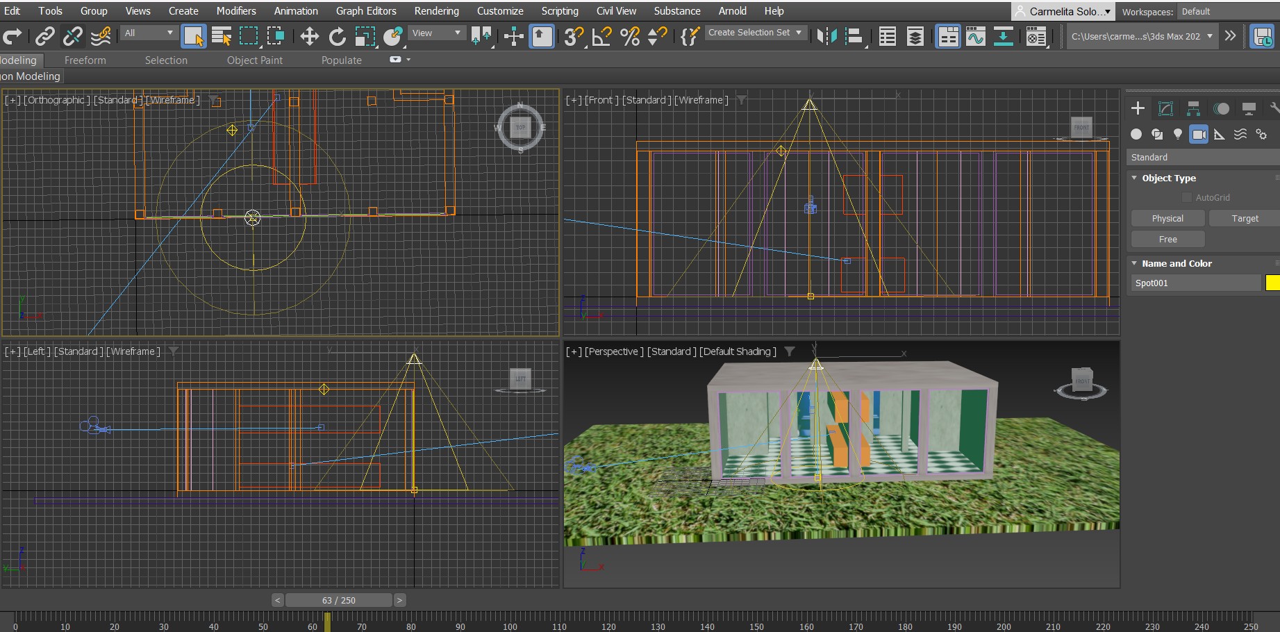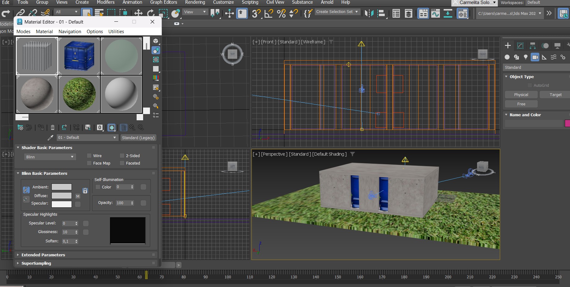 Introdução de elementos como portas, vidros, paredes de betéo e relva, fazendo recurso a ferramentas utilizadas na aula anterior.