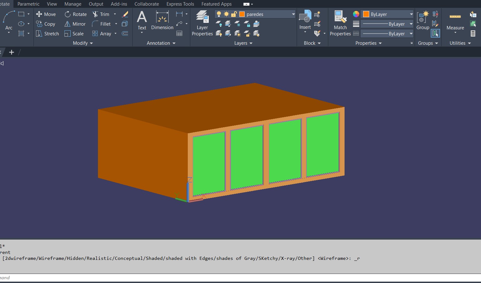 Mudança dos elementos para as suas layers e cores correspondentes. Depois, união das paredes e pilares, através do comando: UNION.