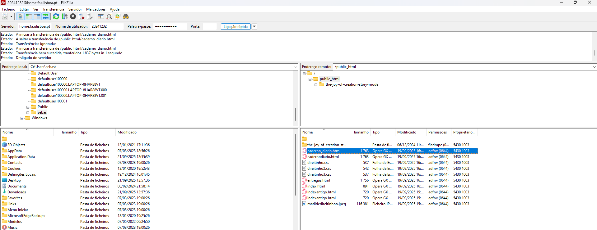 Já com a página pessoal atual concluída, publicámos no servidor da Faculdade de Arquitetura da Universidade de Lisboa, com a ajuda do FileZilla.