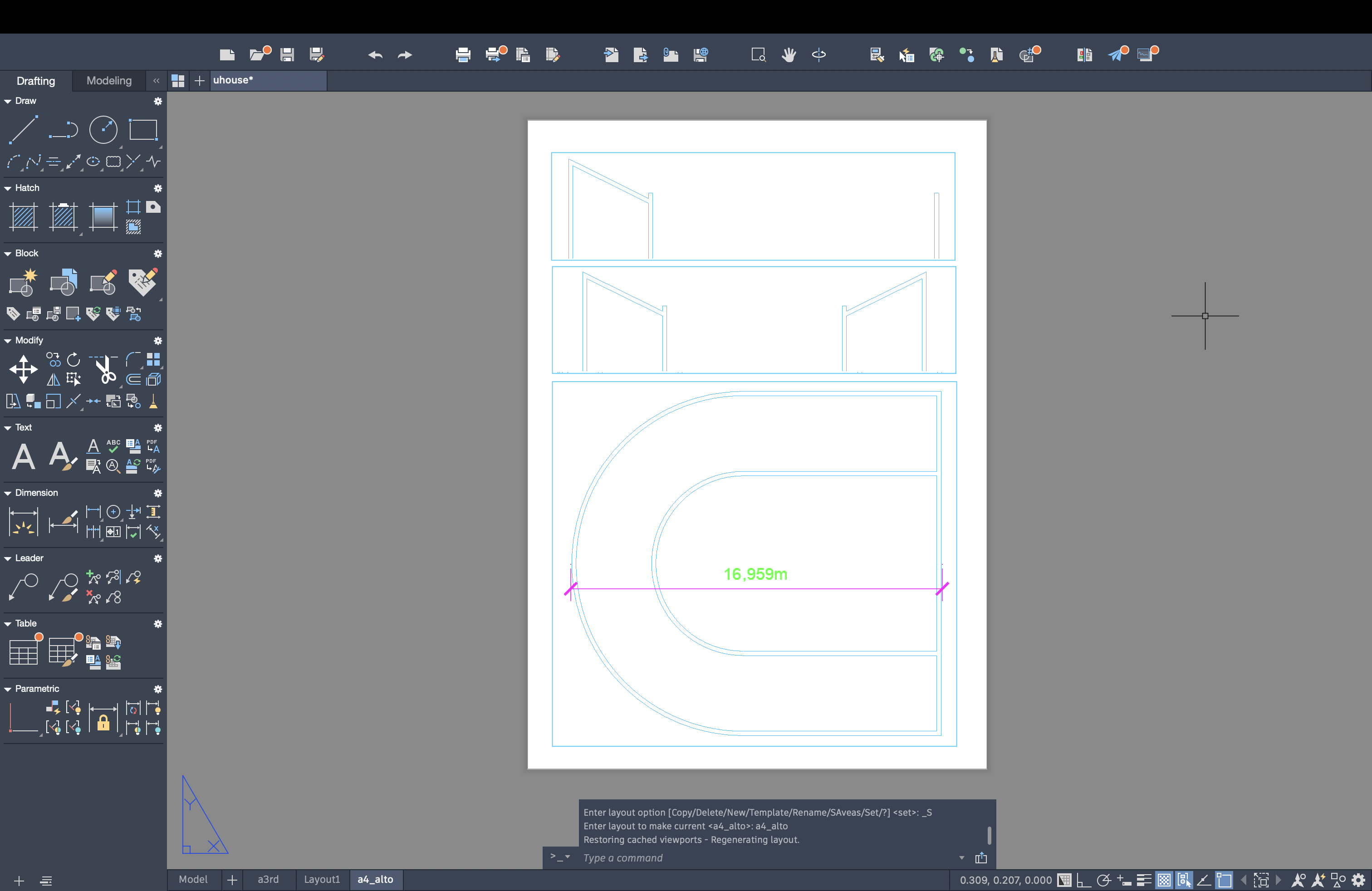 Criação de um layout A4, onde se inseriu a planta e respetivos perfis escalados. Atribuição de cotas à planta com o comando DIM.