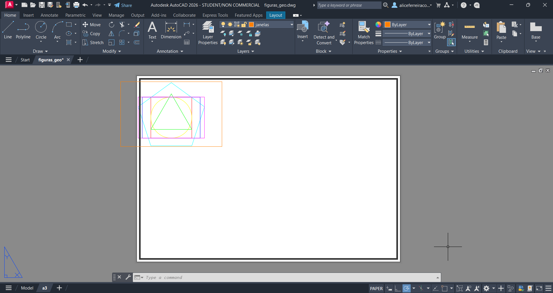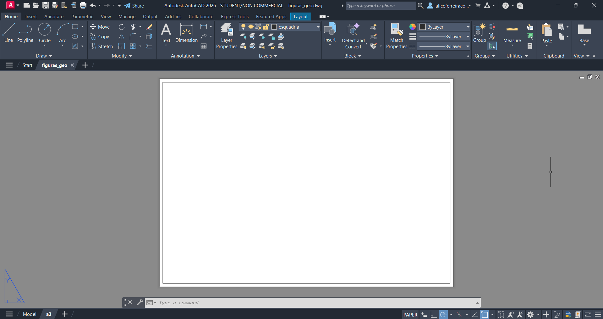 Criação de uma nova folha denominada de "layout" onde usamos uma esquadria para as suas margens assemelhando-se a uma moldura.