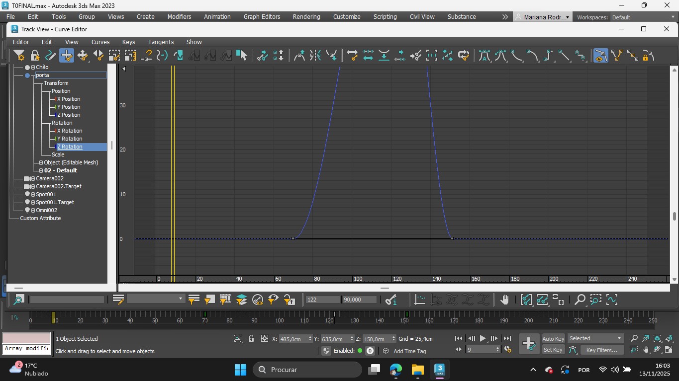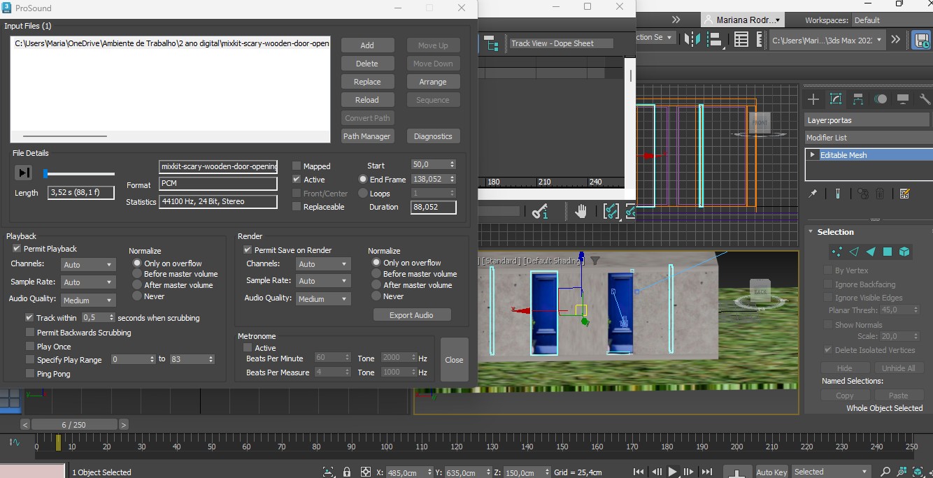 Introdução de elementos sonoros, como uma porta a abrir, através da ferramenta GRAPH SHEETS E DOPE SHEET.