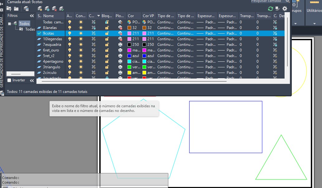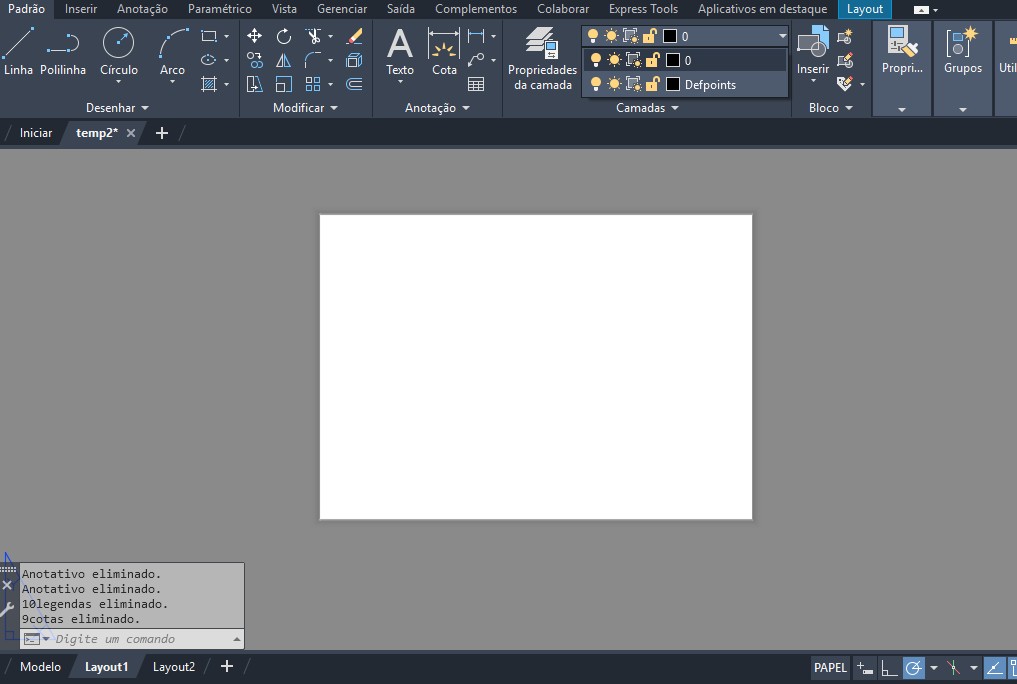 Criação de duas novas camadas, "cotas" e "legendas", respectivamente.
